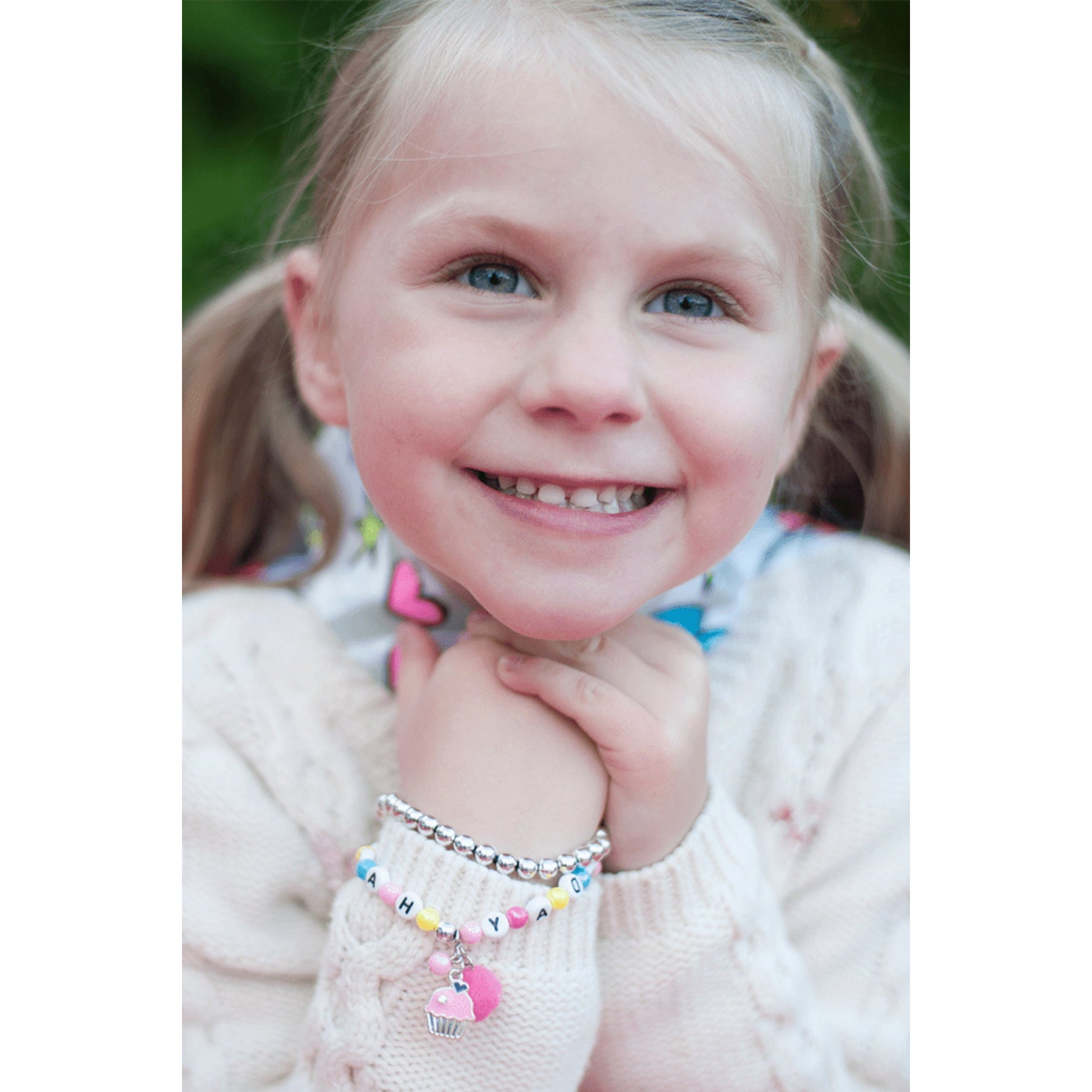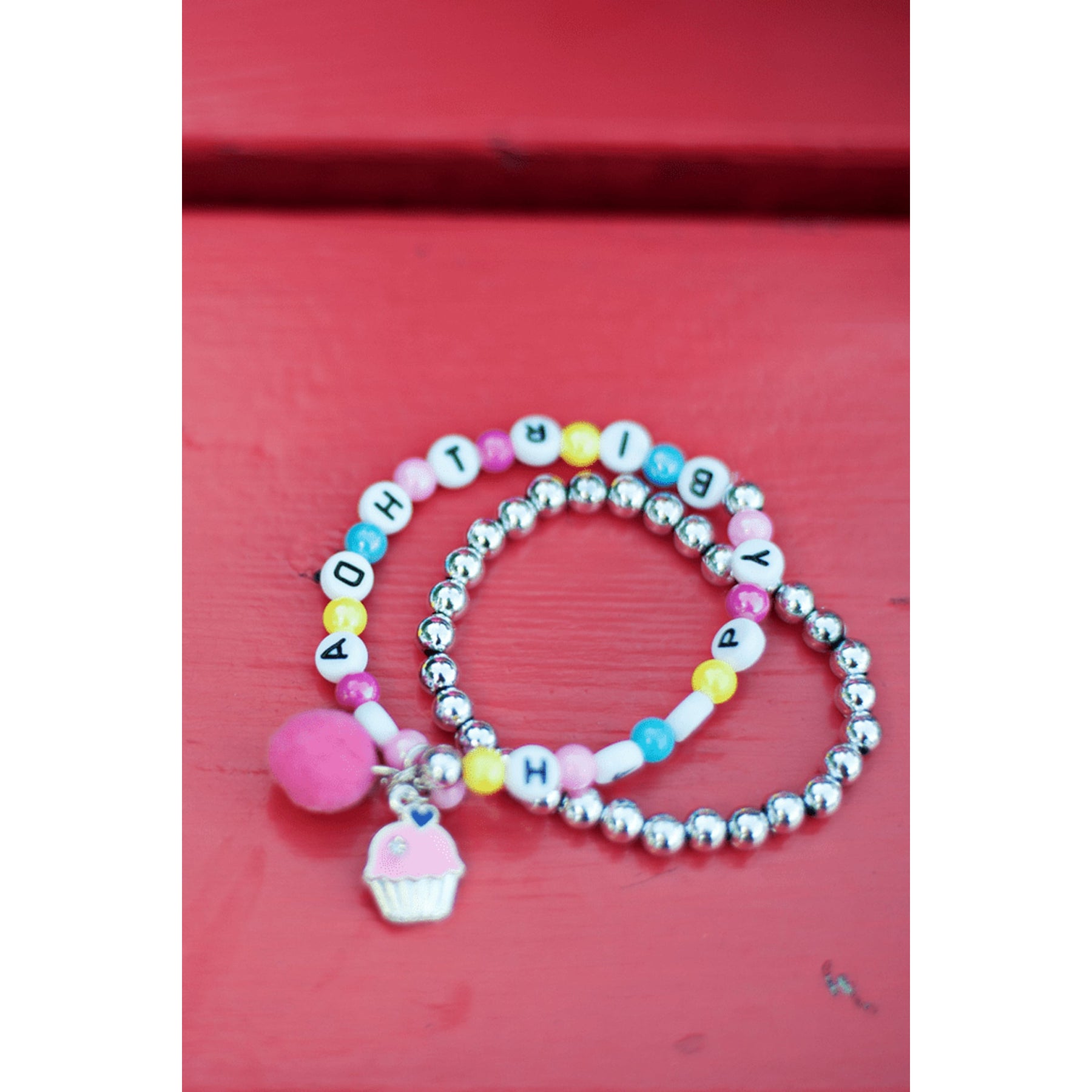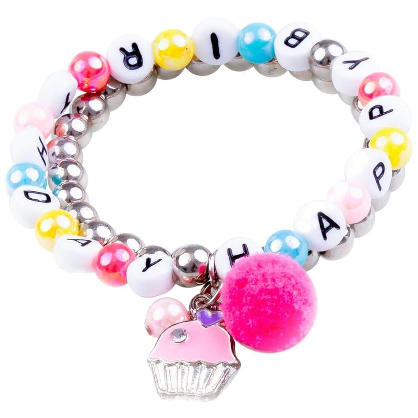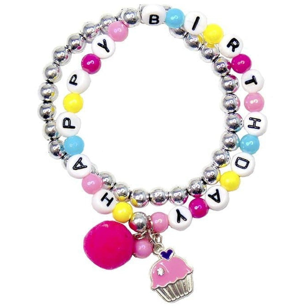 Your little ones birthday just got that much sweeter. This 2 piece bracelet set features a perfect pink cupcake and magenta pom pom dangle with a pearlized pink bead. 'Happy Birthday' is spelled throughout the multi coloured strand making sure everyone at the party will know who's one year older!