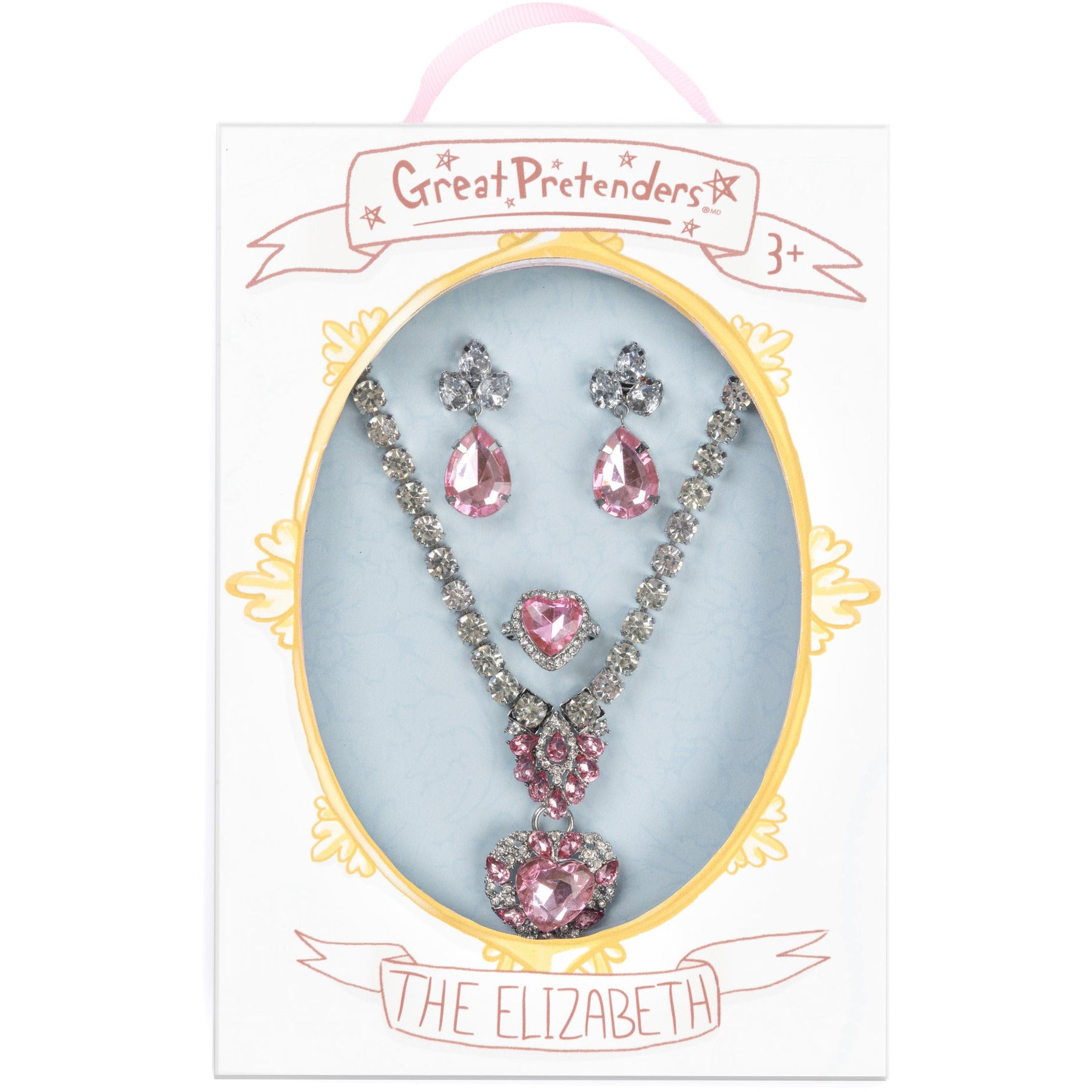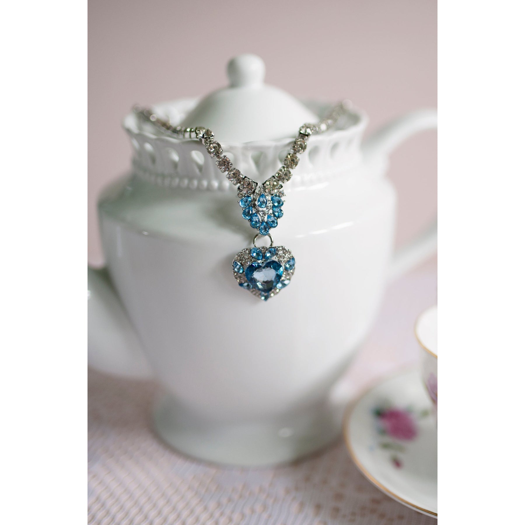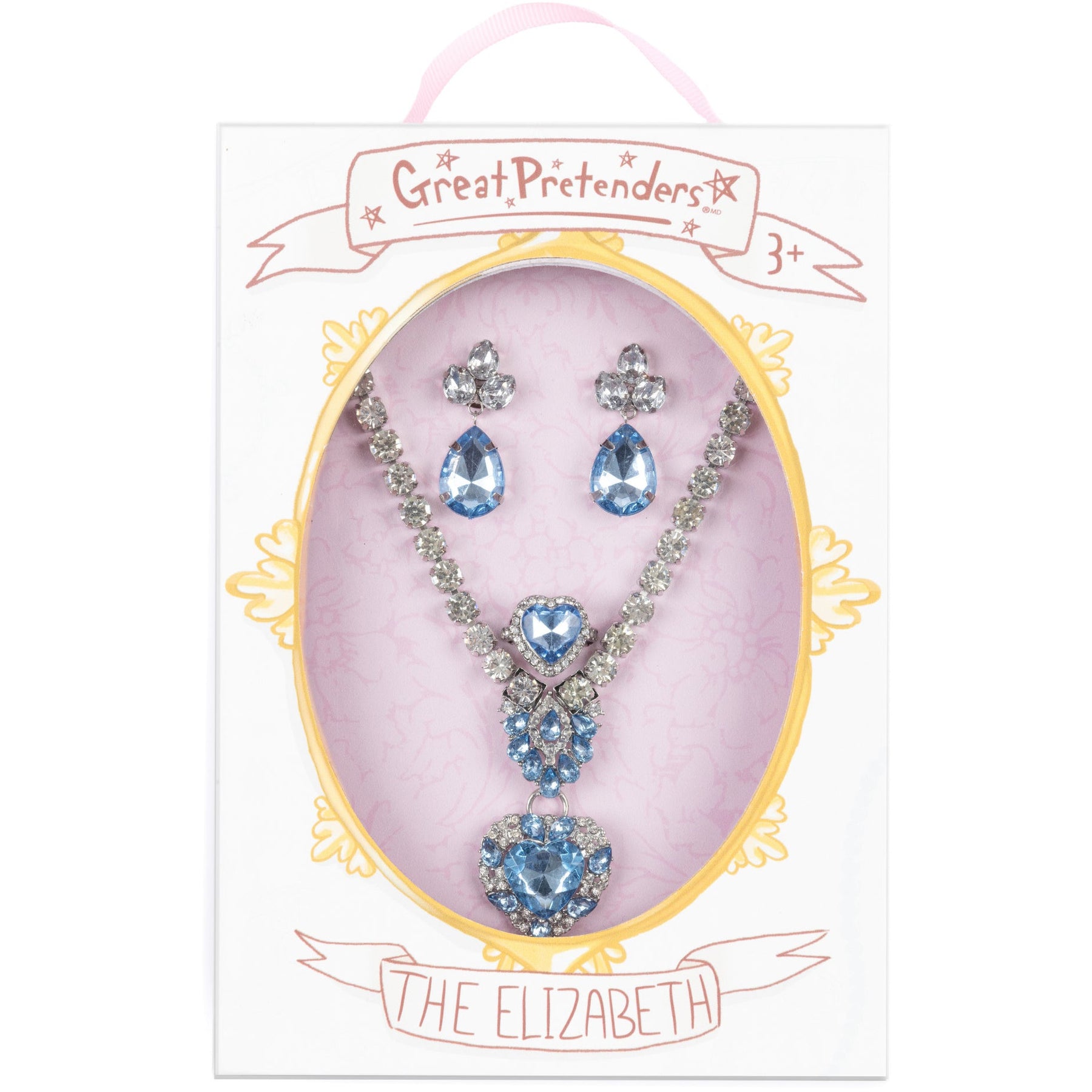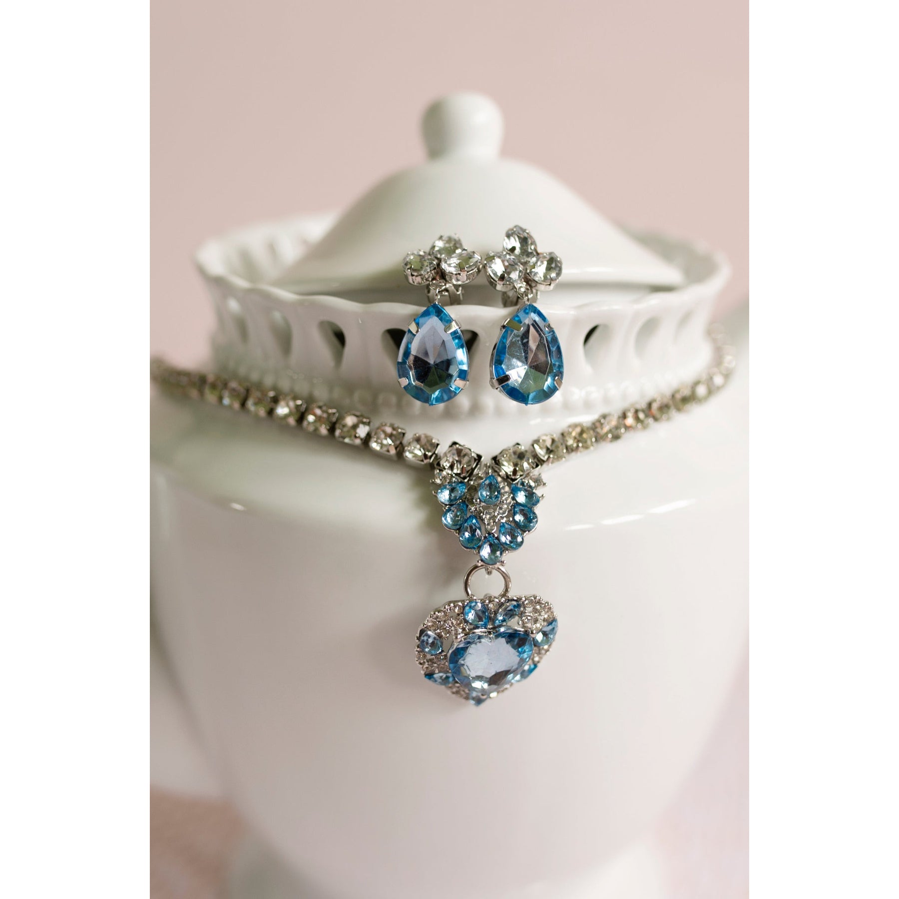 Classic glamour gets a modern twist with The Marilyn 4 Piece set. This bold and beautiful boxed-set includes blue & silver clip-on earrings, a heart-shaped ring, and a coordinating necklace jam-packed with jewels.
