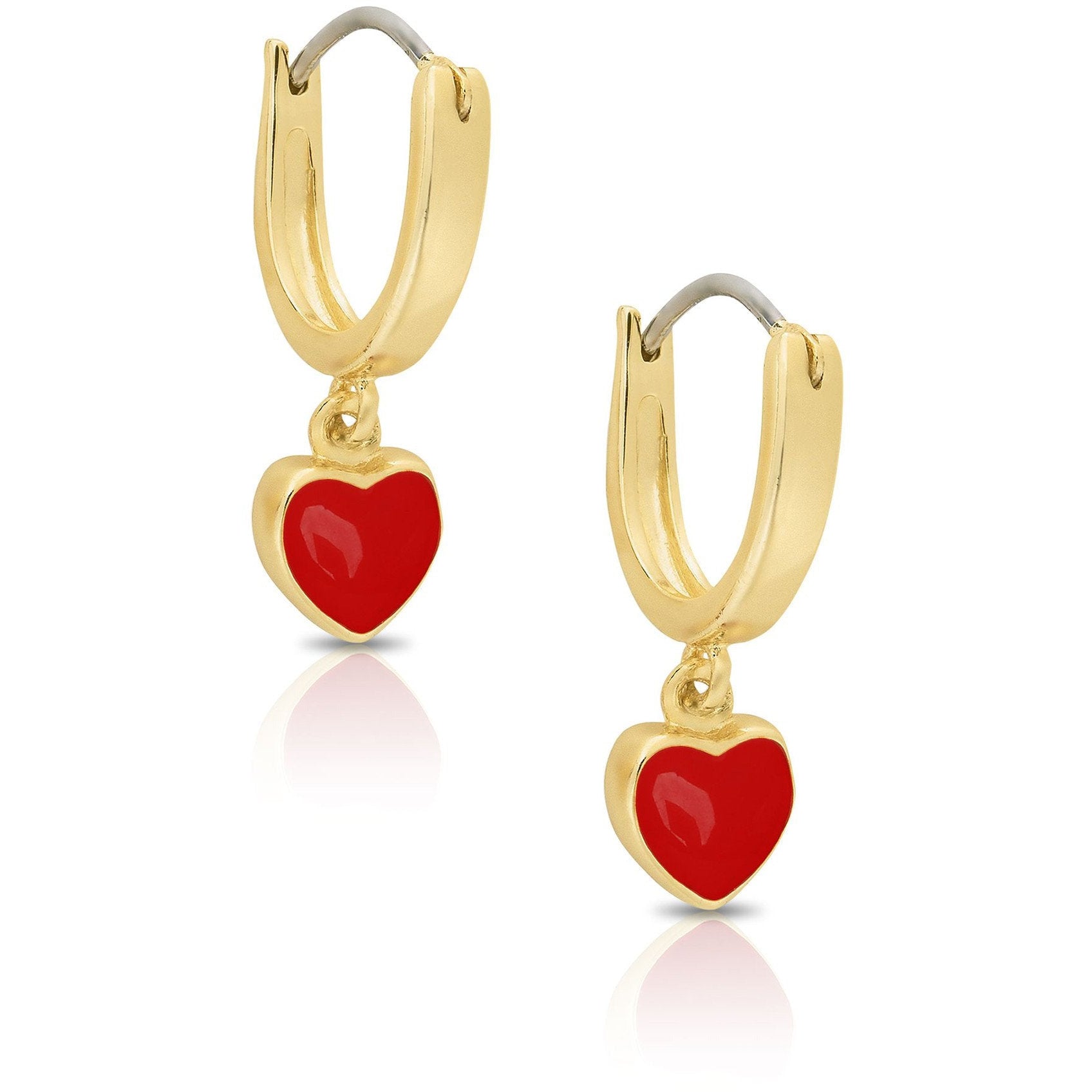 These beautiful drop earrings for girls are 18k gold plated and feature a dangling heart charm with hand-painted enamel. Earrings are shined to a high-polish finish and secure with hinged closure.