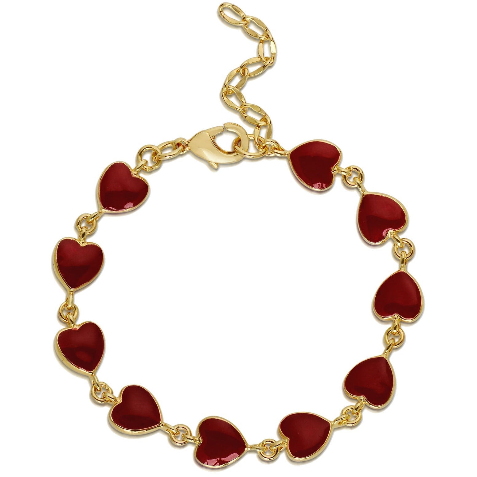 This charming link bracelet is plated with 18k gold and features hearts with hand-painted enamel. Bracelet is adjustable 5" - 6.5" and secures with lobster claw clasp.