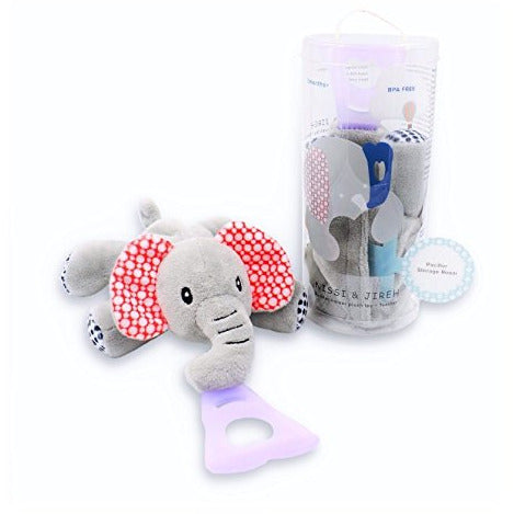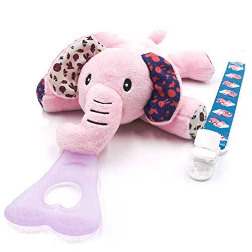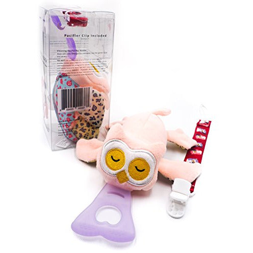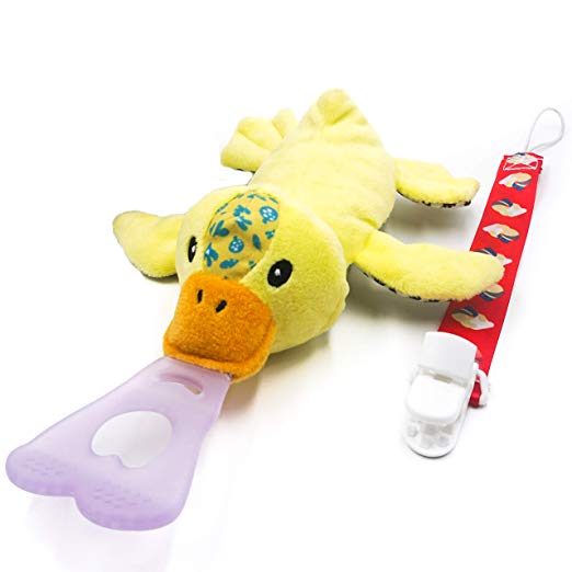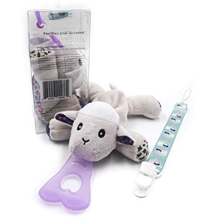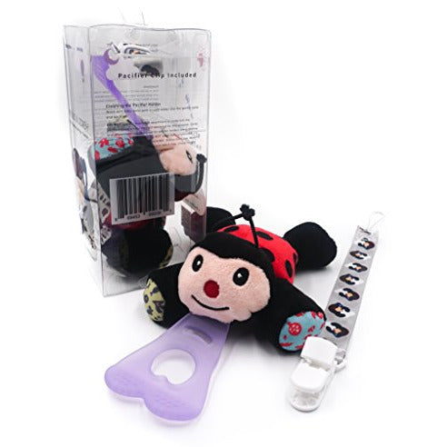 This innovative and versatile baby accessory combines the functions of a Teether, Pacifier Holder, Storage/Travel Case, and a Visually Stimulating Plush Soother.