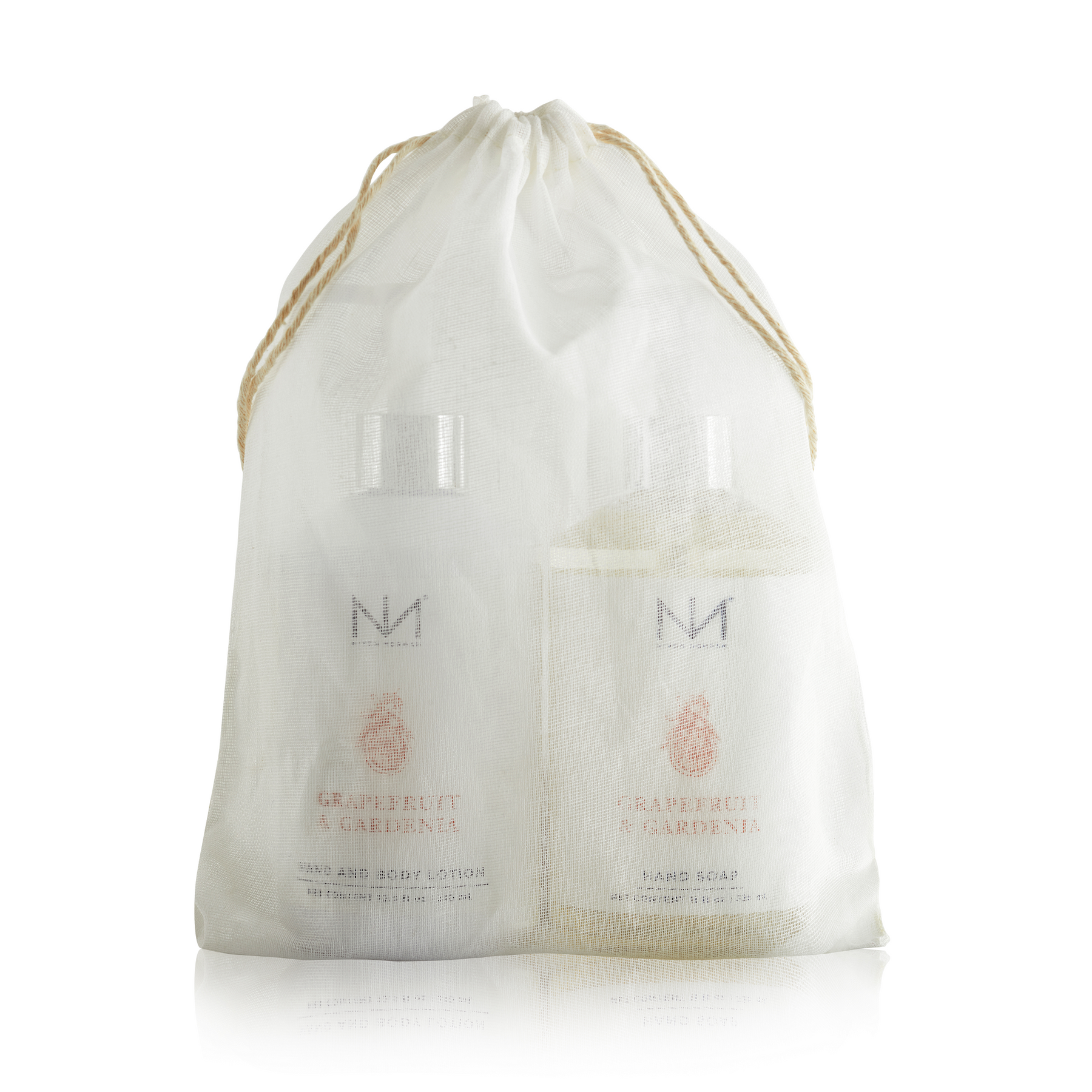This giftable set includes hand soap and hand lotion in a white sheer cotton draw string bag. A perfect gift ready to go.