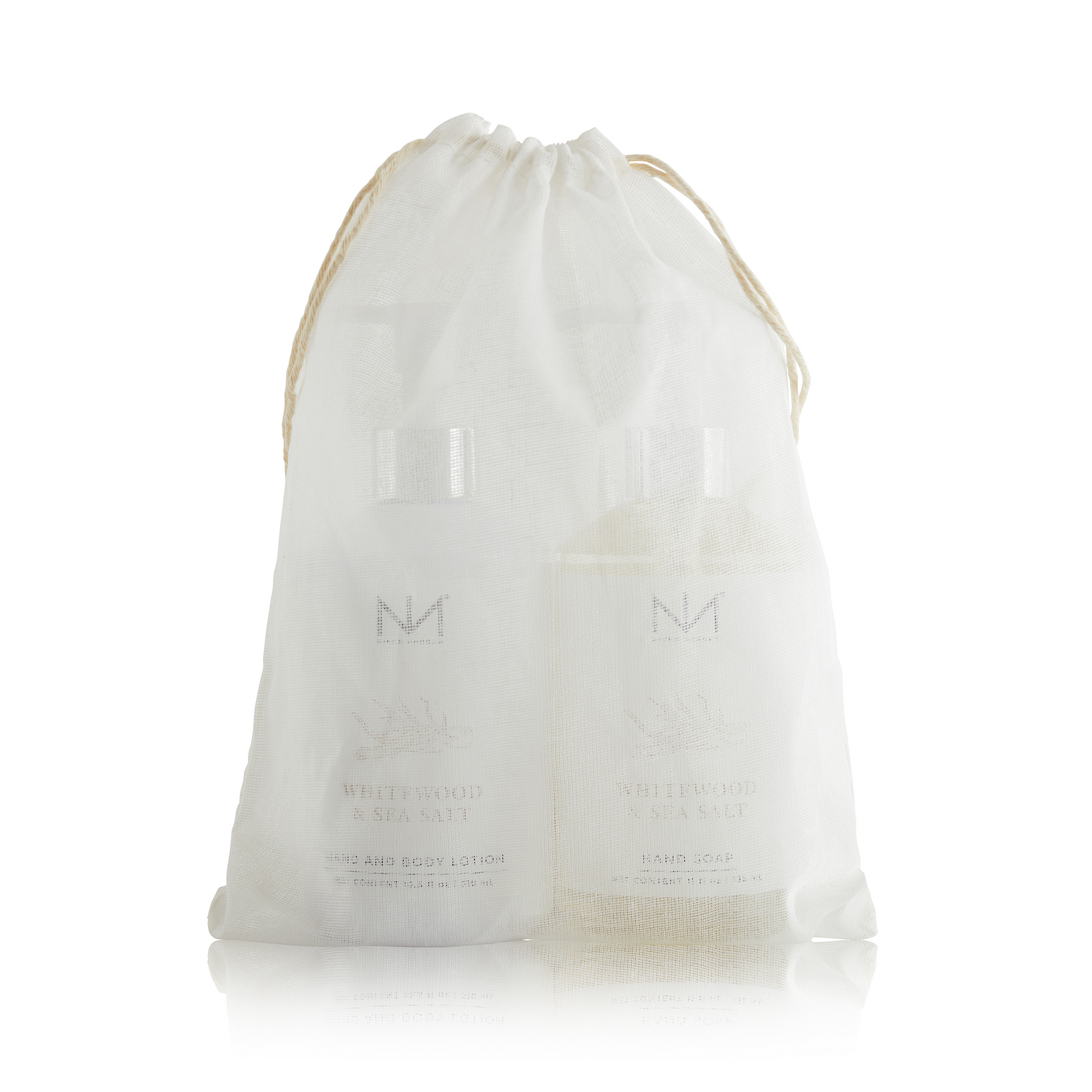 This giftable set includes hand soap and hand lotion in a white sheer cotton draw string bag. A perfect gift ready to go.