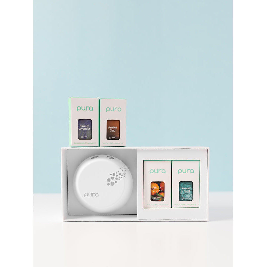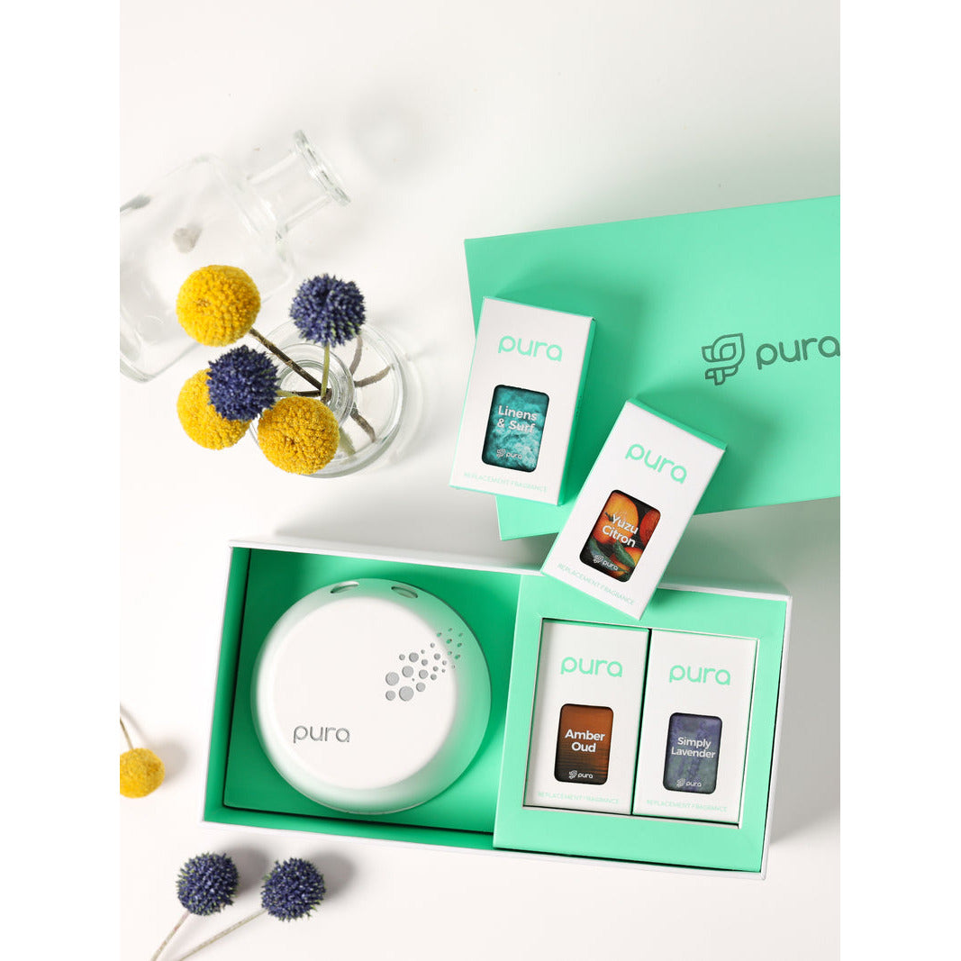 This set includes four of some of Pura’s favorite scents, Linens & Surf, Yuzu Citron, Amber Oud, and Simply Lavender, and a Pura Smart Fragrance Diffuser.