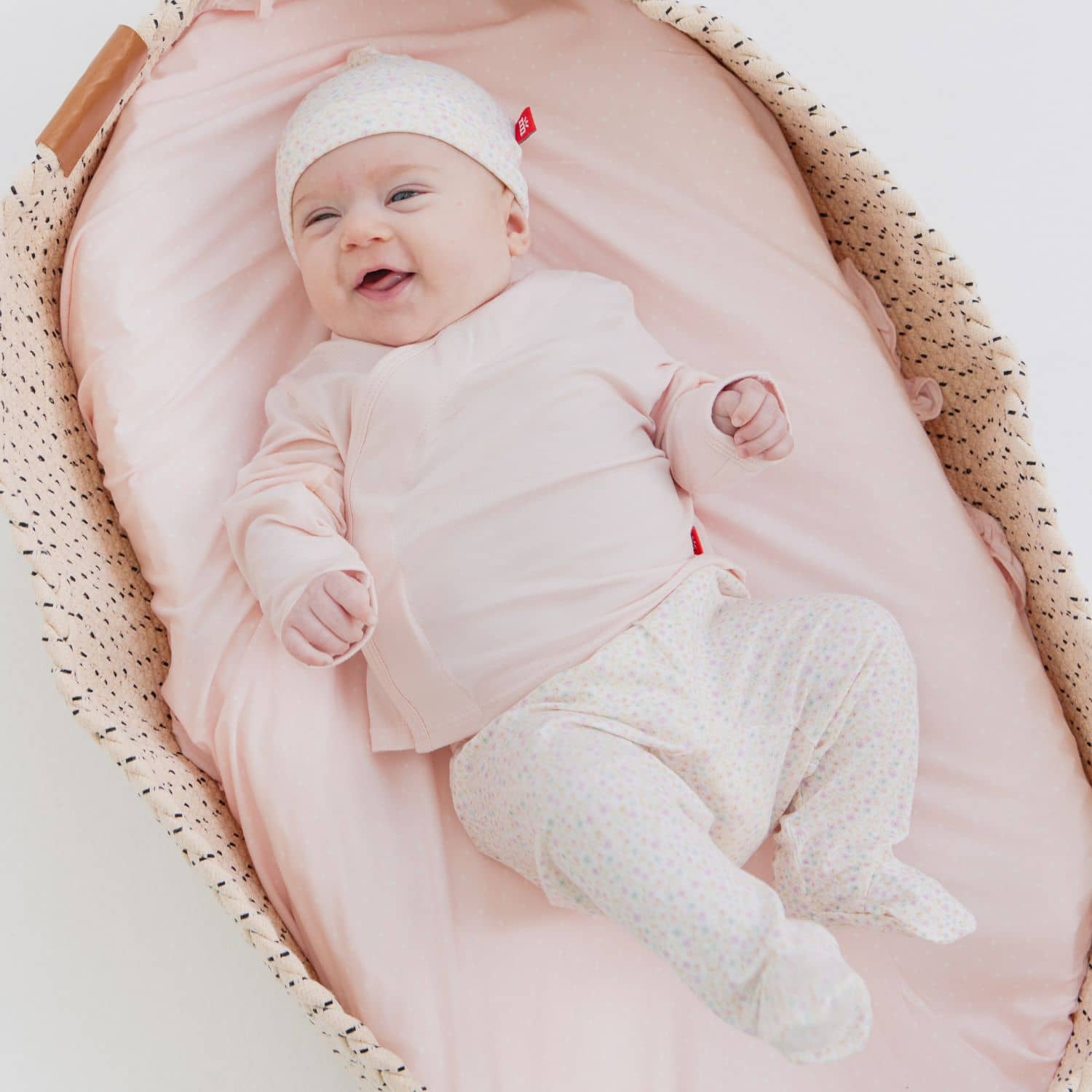 welcome baby in the cutest, comfiest take me home kimono set. the kimono top is designed to be gentle on healing belly buttons with magnetic closures that are great for fast, fool-proof changes, and the entire set is made of softer-than-soft TENCEL™ modal. pack it in your hospital bag as a coming-home ensemble and then use it for the weeks that follow.