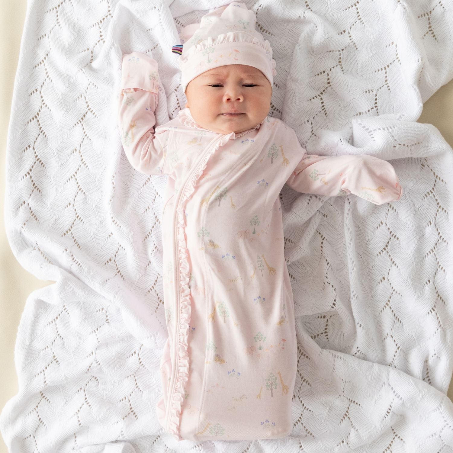 The cozy sleeper gown + hat set is a wardrobe staple for newborns who require constant diaper changes (aka all of them). with magnets down the front, baby stays in the gown during the diaper switcheroo: separate magnets, put on a freshy, click magnets, done. other amazing features: eco-friendly TENCEL™ modal fabric and built-in mitten cuffs.