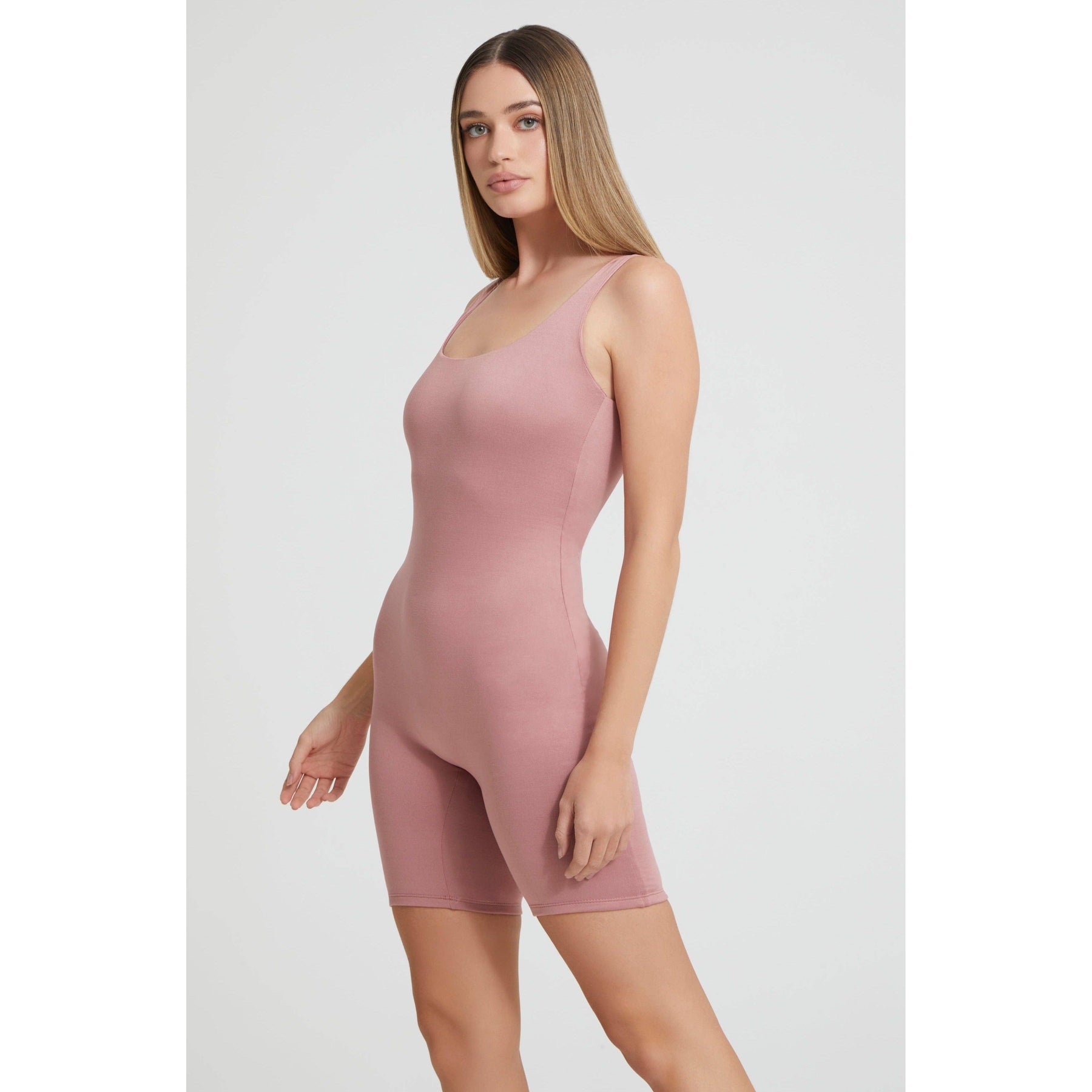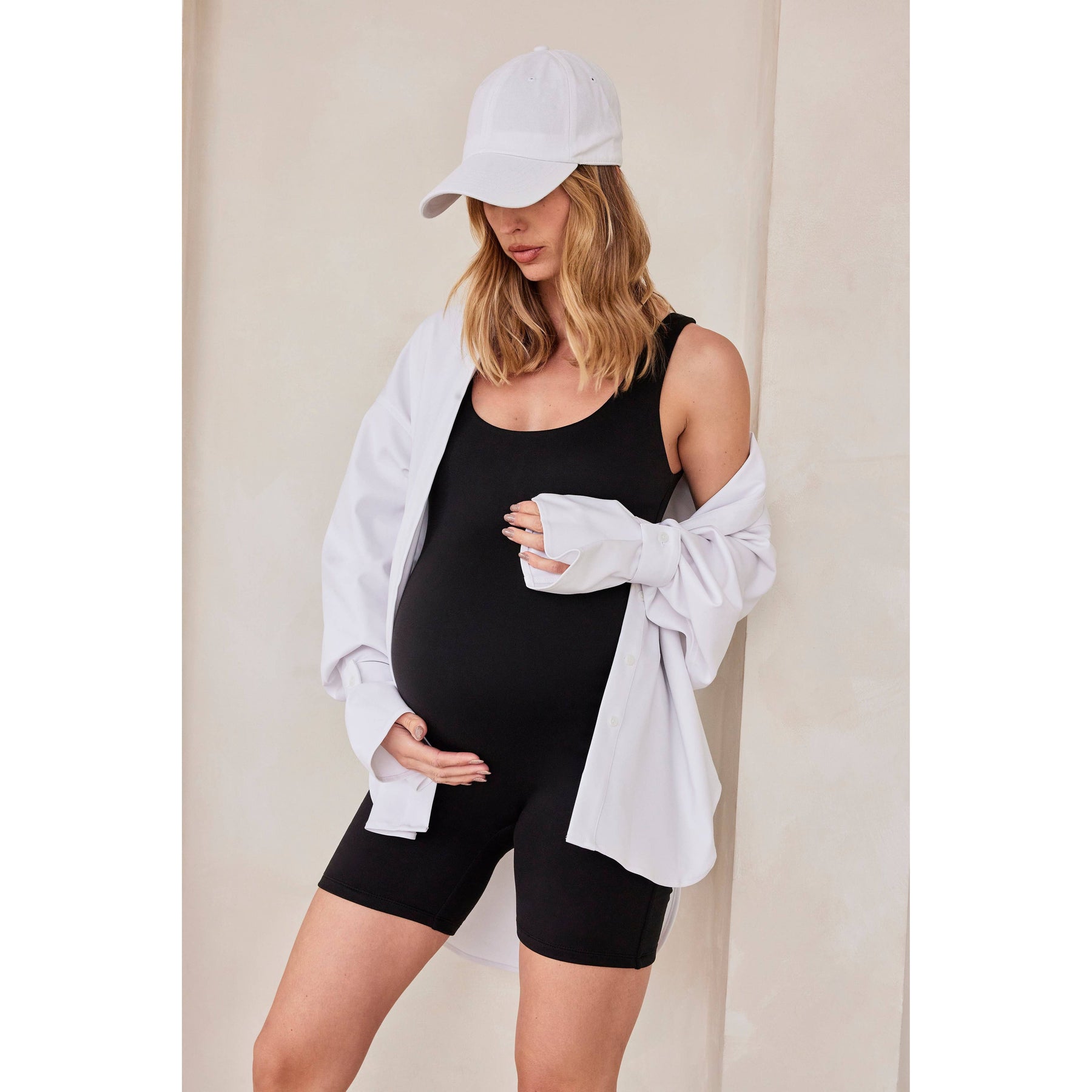 The Cindy maternity unitard. The romper you won't want to take off this summer! The Cindy features a tank top style bodysuit with an easy-to-wear bike short, making for a great dress-up dress-down style. Perfect for maternity, postpartum, and beyond. Made of a lightweight, 4-way stretch brushed jersey fabric, this romper will maintain fit and support all day long!    Product description.  Super soft 4-way stretch fabric. Brushed jersey for fit and support.  Double-lined.  97% polyester, 3% spandex. Sizing.  Bumpsuit material is made to gently stretch with the body through the stages of pregnancy. We recommend ordering a Bumpsuit in your regular size.  Our models are all wearing a size S. Bumpsuit makes high-quality maternity and postpartum clothing that is easy to style throughout the seasons of pregnancy and beyond.