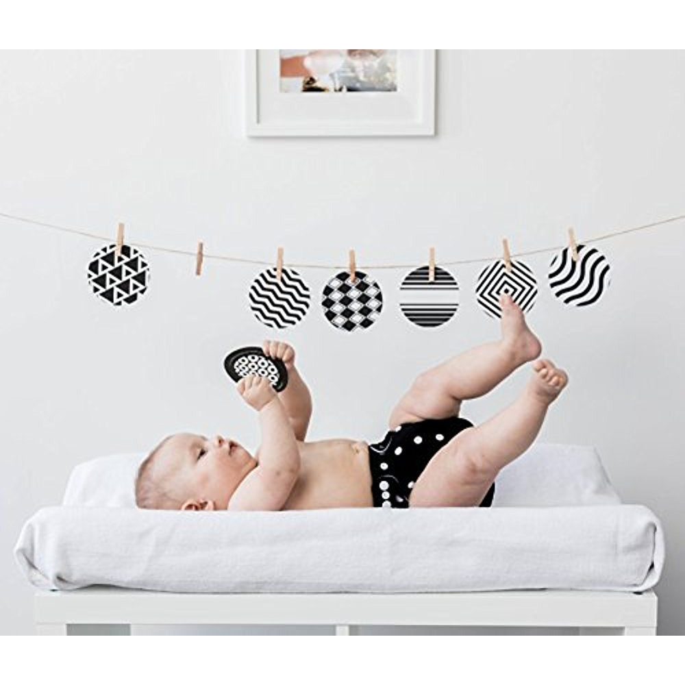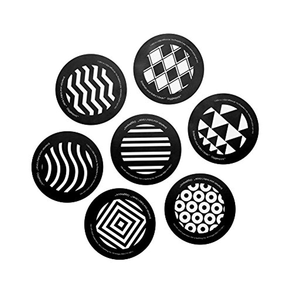 These small circles lead to wide-eyed babies. The high-contrast black and white spots are designed to entertain your babyÕs growing brain! Perfect for developing vision, these 3.5 inch circles are conveniently sized to slip into your pocket, diaper bag or purse. Hook-and-loop dots are included in each package of Gigglespots along with a small strip of loop-tape. They will stick to just about anything fuzzy once the dots are applied. Using the loop-tape, spots can be attached next to car seat, stroller, changing table, or just about anywhere! Gigglespots can be hung on clip-style photo mobiles and are a great way to keep your baby engaged while at the changing table. As baby grows, the spots make tummy time engaging. Spots are printed on water-resistant cardstock that is durable and easy to clean. Use Gigglespots with adult supervision, as they are not intended as a teething toy.