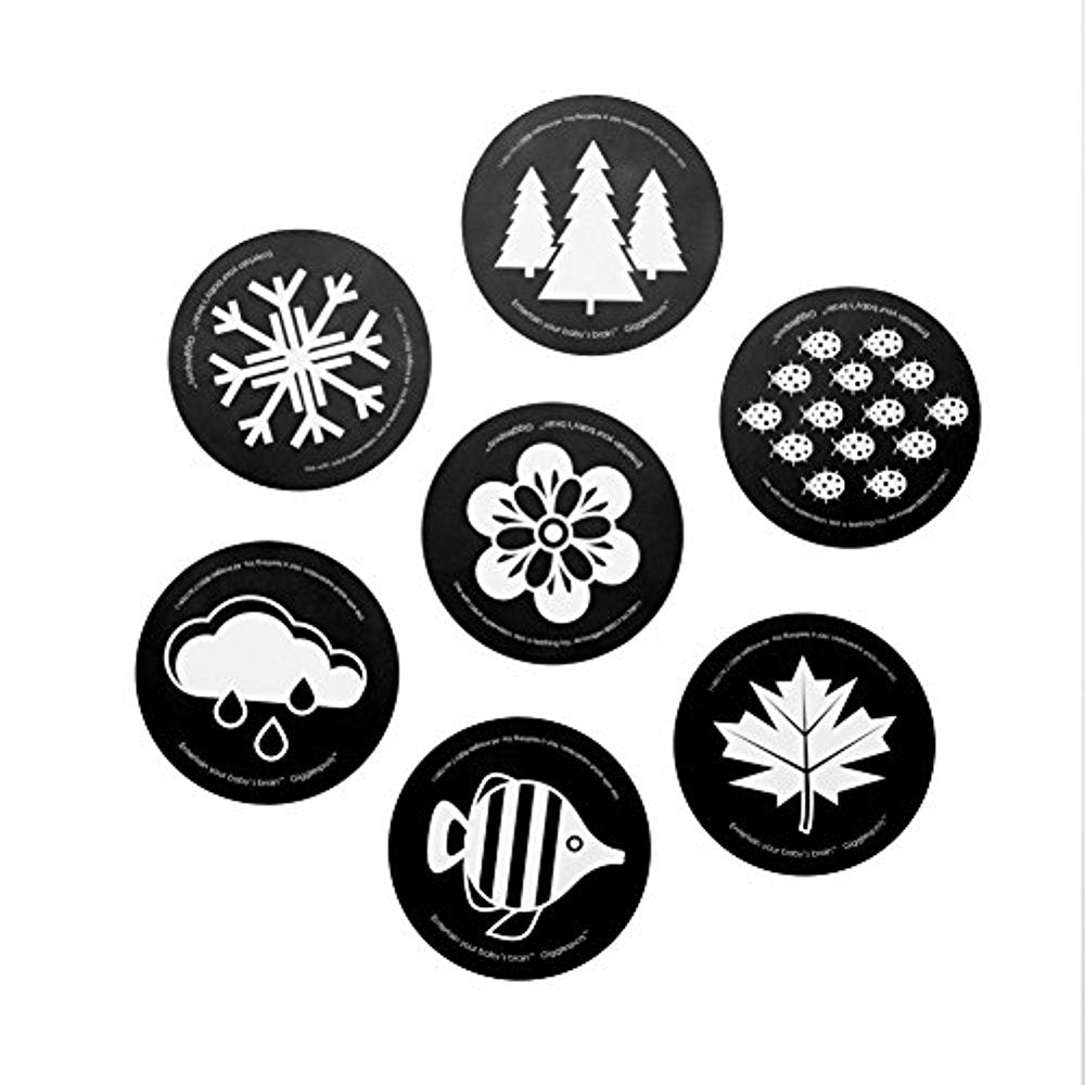 These small circles lead to wide-eyed babies. The high-contrast black and white spots are designed to entertain your babyÕs growing brain! Perfect for developing vision, these 3.5 inch circles are conveniently sized to slip into your pocket, diaper bag or purse. Hook-and-loop dots are included in each package of Gigglespots along with a small strip of loop-tape. They will stick to just about anything fuzzy once the dots are applied. Using the loop-tape, spots can be attached next to car seat, stroller, changing table, or just about anywhere! Gigglespots can be hung on clip-style photo mobiles and are a great way to keep your baby engaged while at the changing table. As baby grows, the spots make tummy time engaging. Spots are printed on water-resistant cardstock that is durable and easy to clean. Use Gigglespots with adult supervision, as they are not intended as a teething toy.