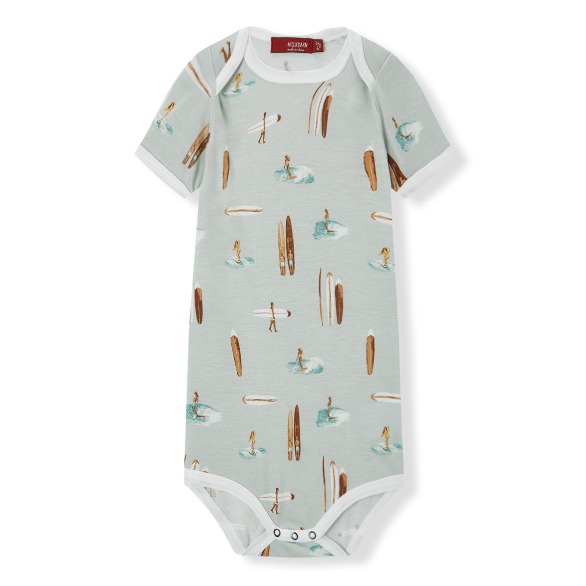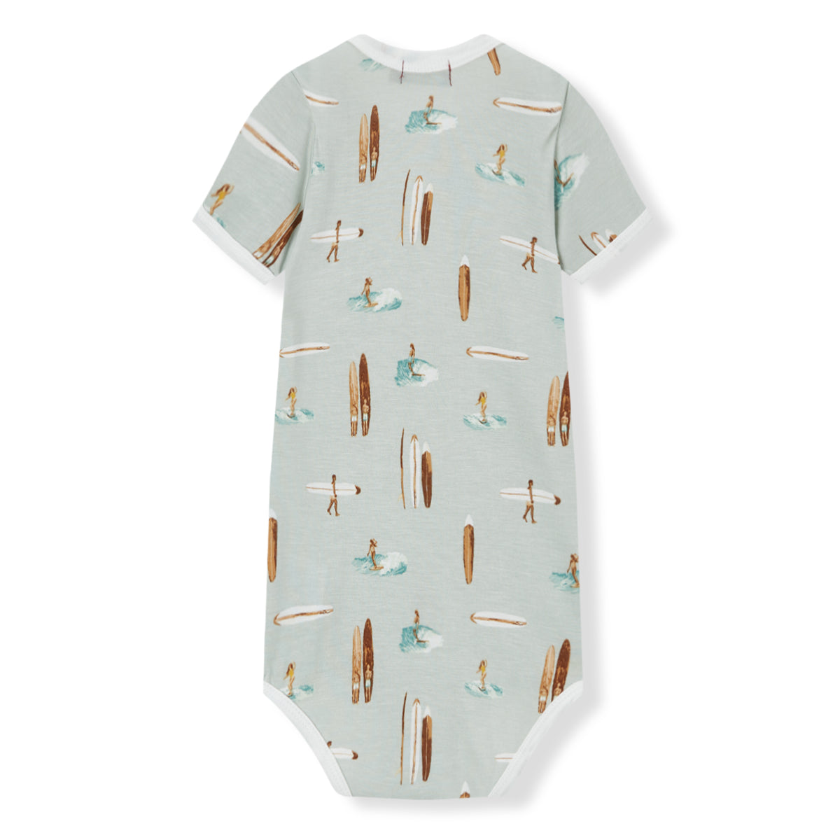 Our soft and soothing baby Bamboo One Piece in the Vintage Surf print merges understated form and functionality. The envelope neckline and ring-snap closures allow for effortless, one-handed undressing of your little one. The contrasting edging highlights the structure and fabric design. Complete your little one’s ensemble by pairing this One Piece with other Milkbarn treasures.