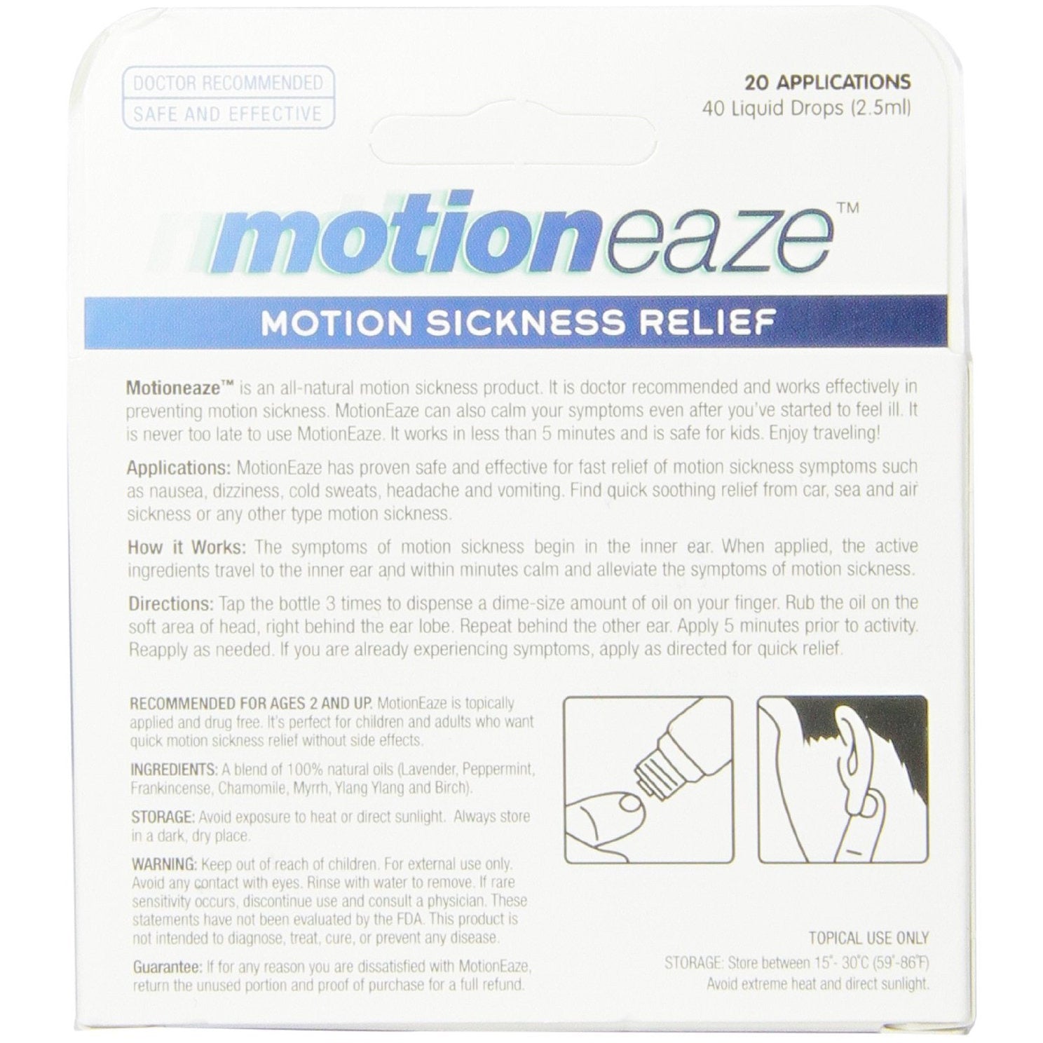 MotionEaze is an incredibly effective all-natural motion sickness treatment. Whether you want to prevent occasional motion sickness or stop the symptoms after the fact, MotionEaze does the job. No matter if it's sea sickness, car sickness, air sickness or any other activity where motion poses a problem, MotionEaze really works. The symptoms of motion sickness begin in the inner ear. When MotionEaze oil is applied just behind each ear lobe, the oil is absorbed through the skin and the active ingredients travel to, and calm, the inner ear. In turn, this relieves the symptoms. No pills to take. When you are nauseous, the last thing you want to do is put something in your stomach-even a pill. MotionEaze is an oil that is applied to the skin just behind the ear. It's perfect for children that have problems taking pills.