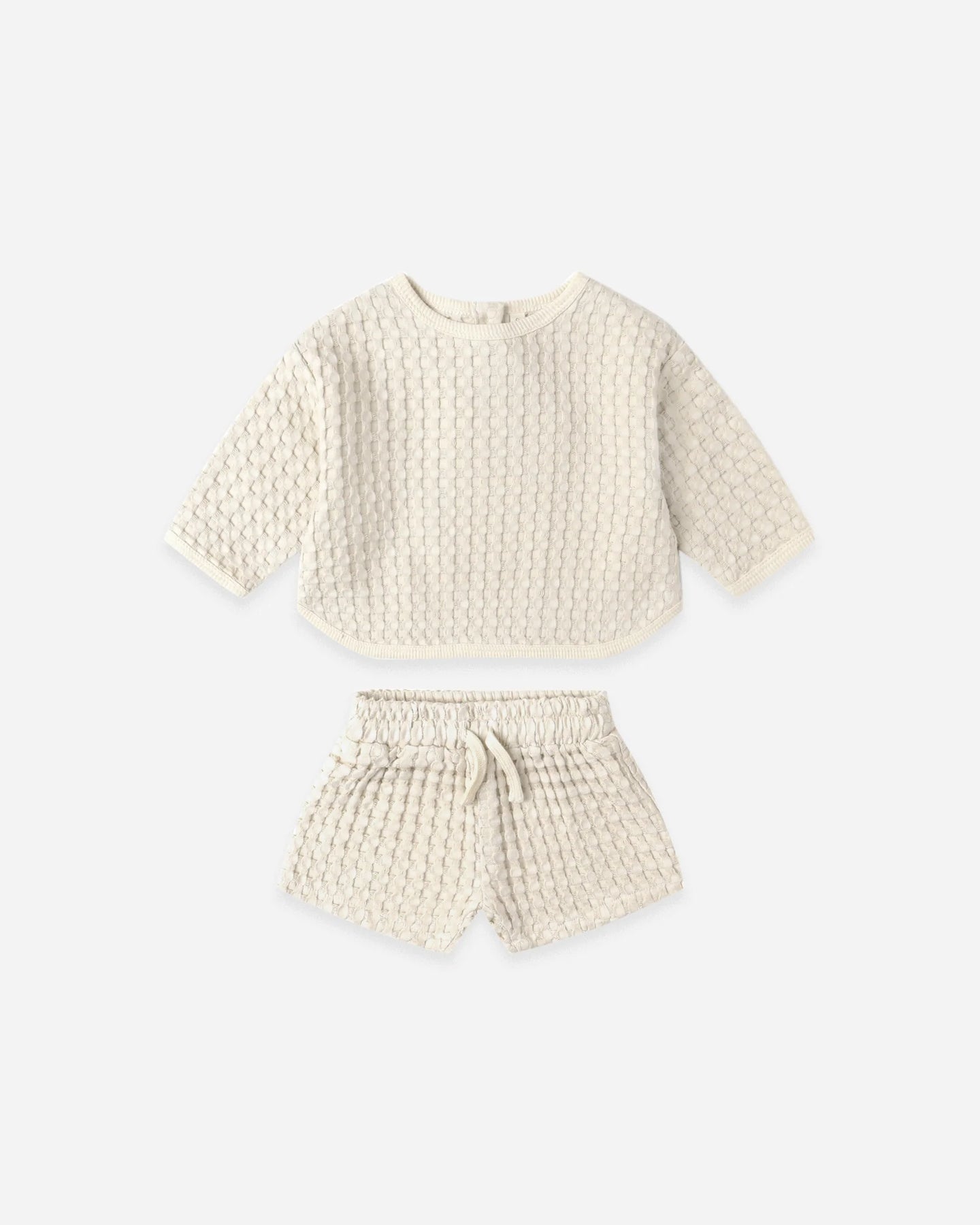 Our Flynn Set is made from our chunky waffle knit and features a boxy long sleeve top with coconut buttons at the back neck, plus matching pull-on shorts for all-day comfort.
