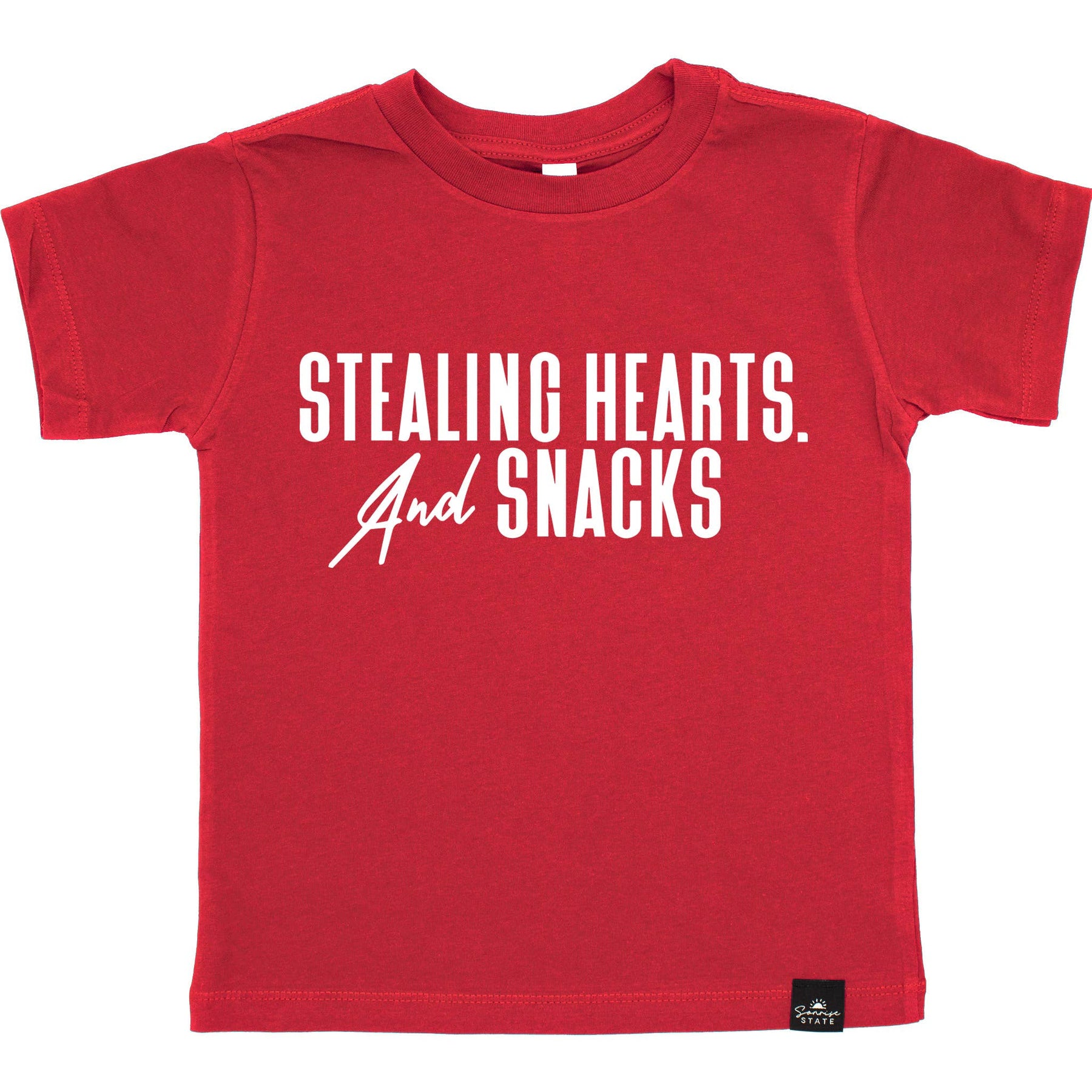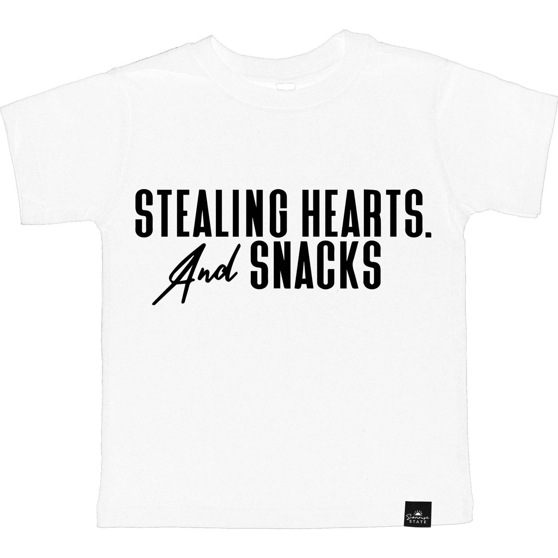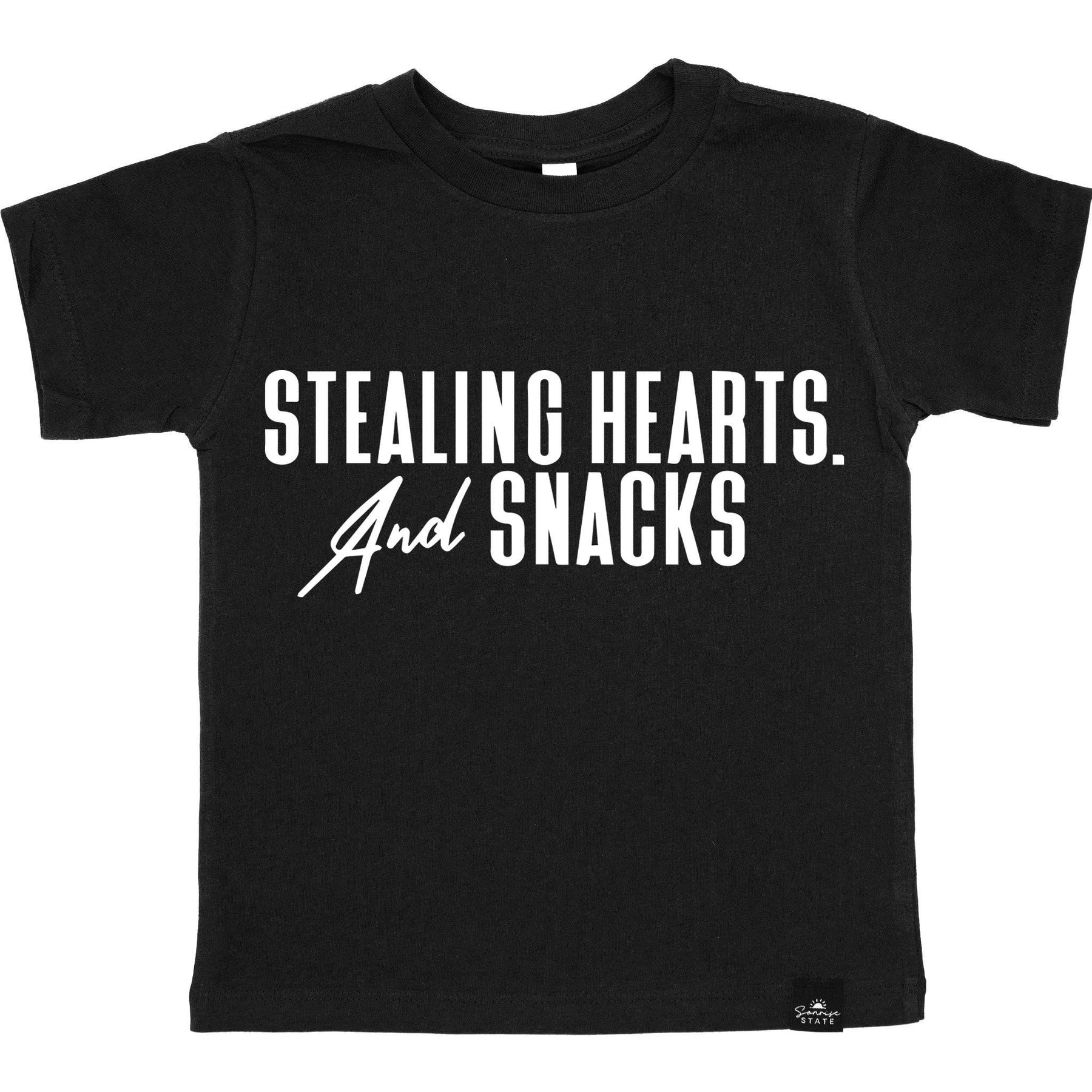 "Stealing Hearts & Snacks" Boy's T-Shirt For mama's little heart breaker and snack taker! Shirt Colors: White, Black, Natural, Red Sizes: 6M, 12M, 18M, 2T, 3T, 4T, 5/6 Cotton Blend