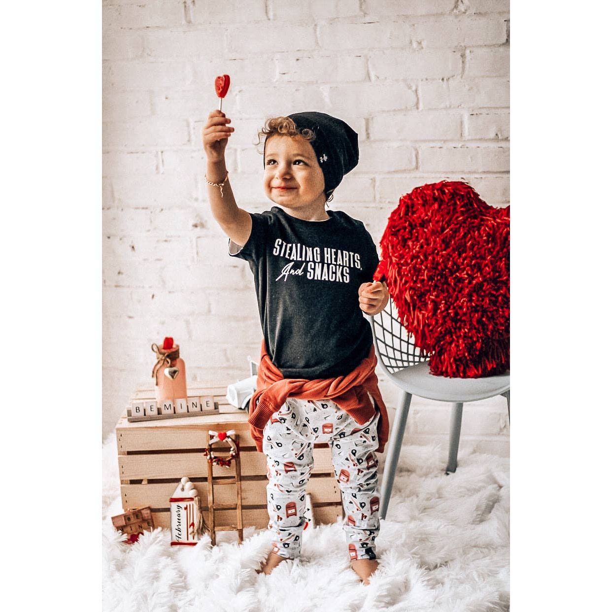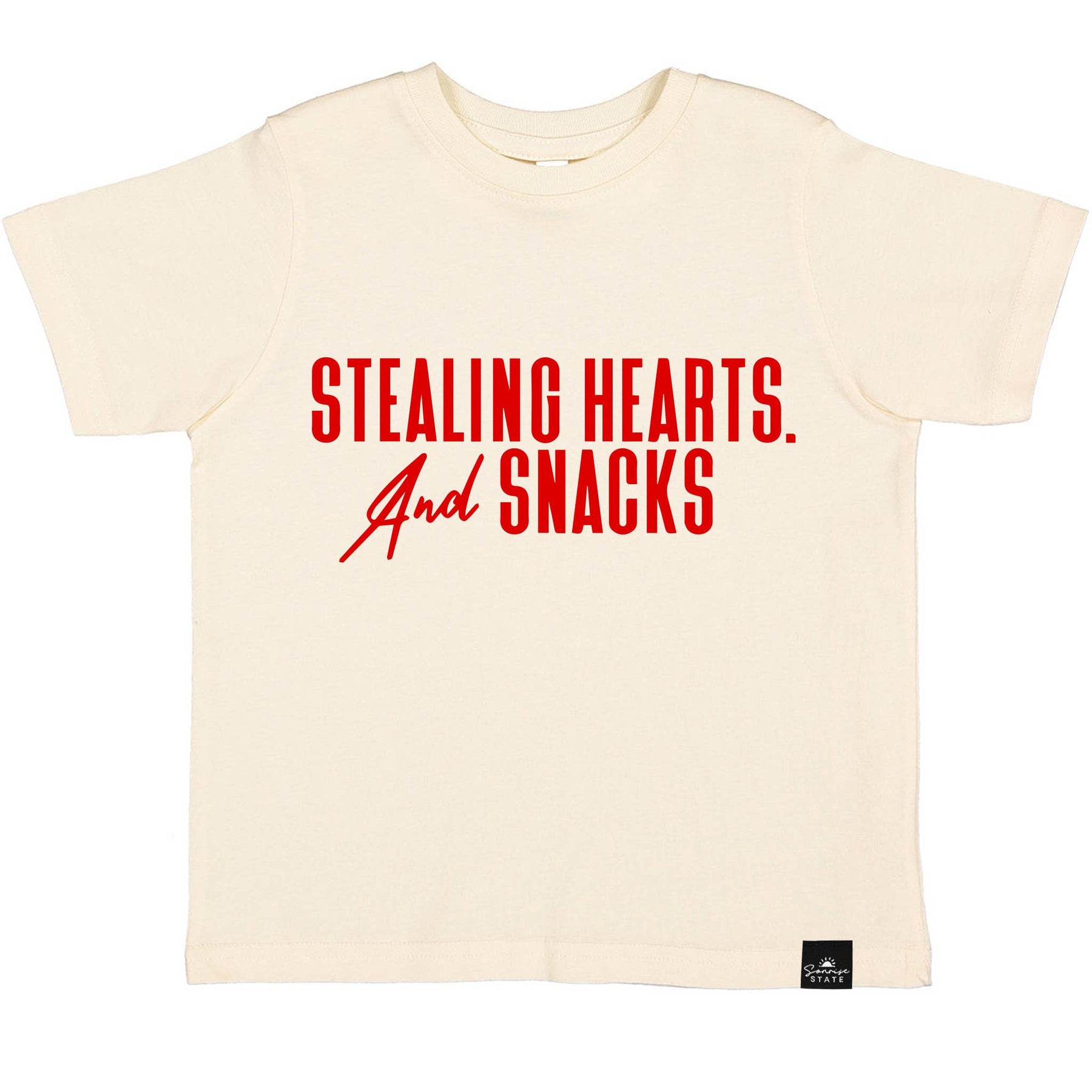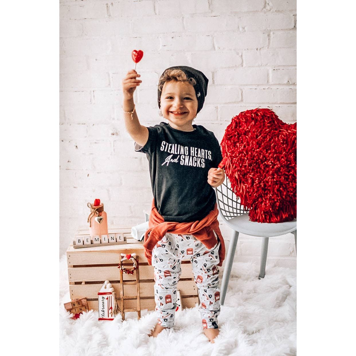 "Stealing Hearts & Snacks" Boy's T-Shirt For mama's little heart breaker and snack taker! Shirt Colors: White, Black, Natural, Red Sizes: 6M, 12M, 18M, 2T, 3T, 4T, 5/6 Cotton Blend