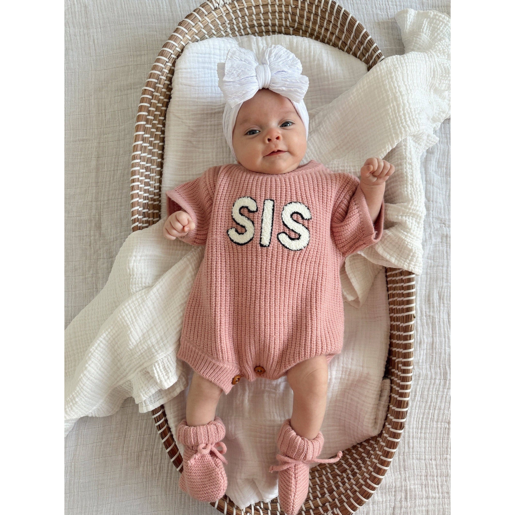 Our cozy and cute knit romper is perfect for baby sis! Featuring a playful message embroidered across the front, this soft, lightweight sweater romper is the perfect way to match big Bro or Sis.