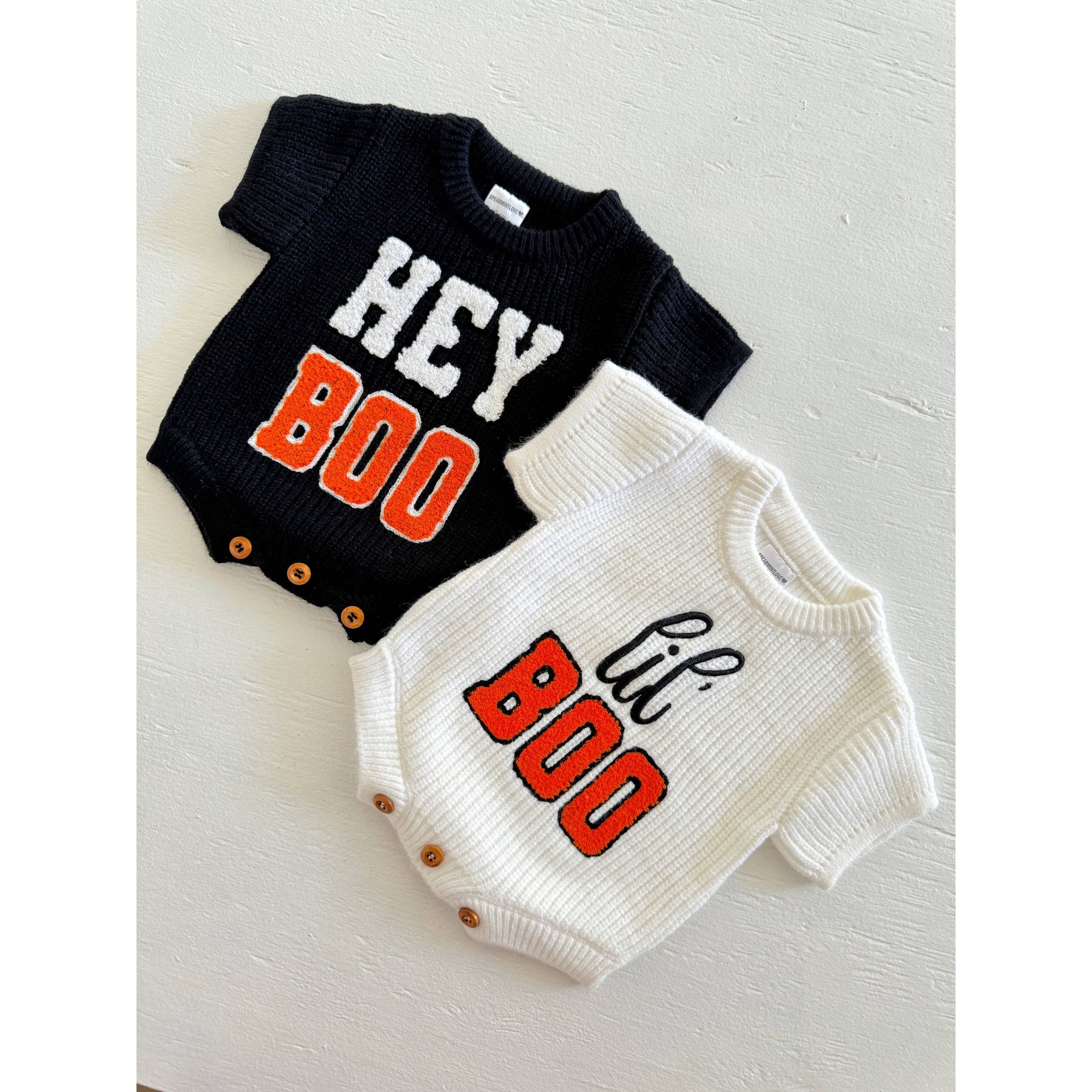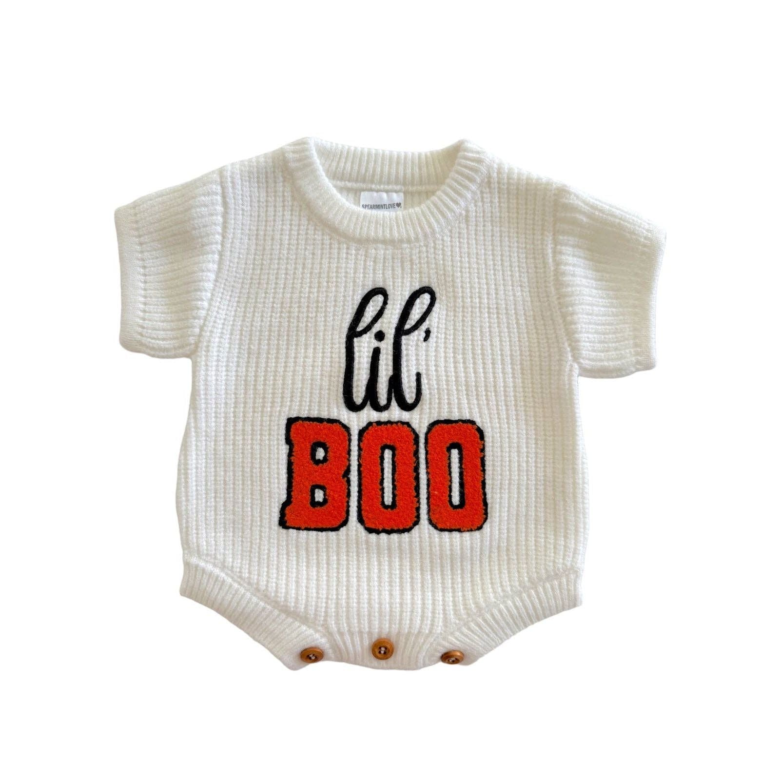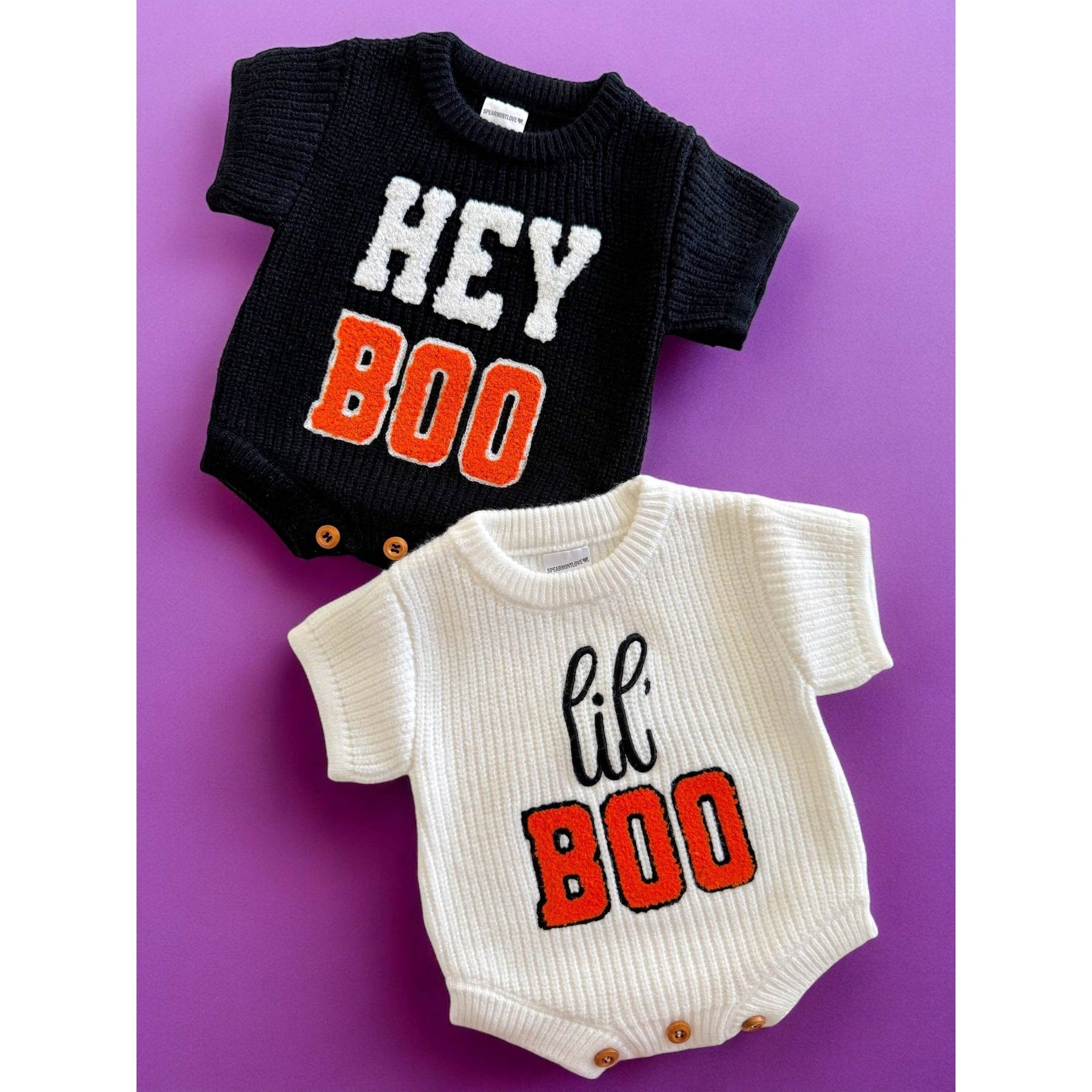 For your Lil Boo! Get in the spooky spirit with these cozy knit sweater rompers, perfect for the Halloween season!