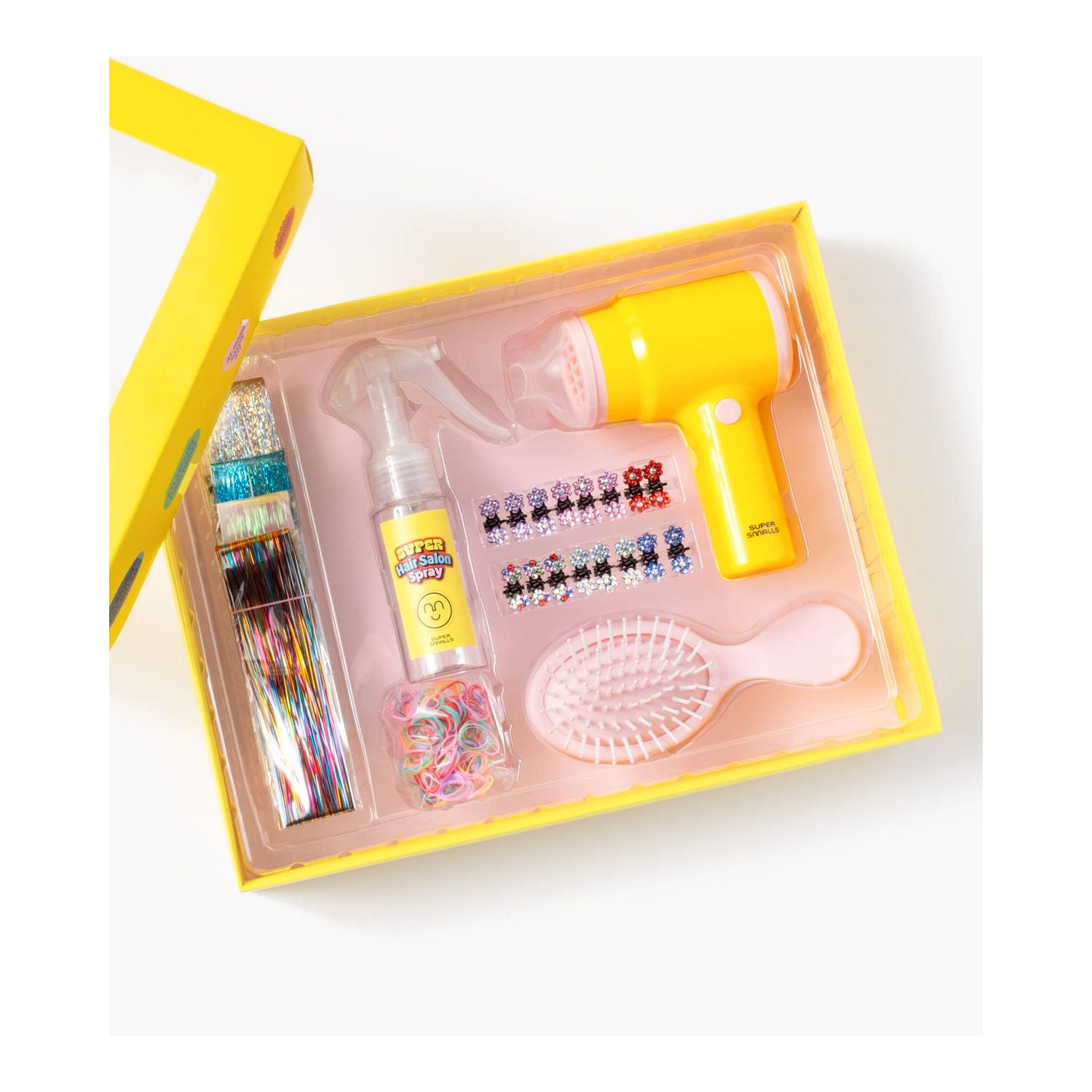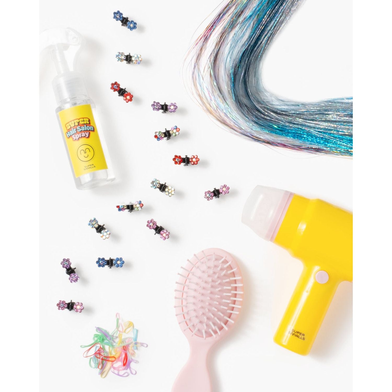 Unleash your inner hairstylist with the Hairstyle Hero Hair Salon Kit! Featuring mini elastics and gem flower clips for versatile styling options, a detangling brush to effortlessly tame your locks, a super hair dryer that lights up and lightly blows air, a spray bottle for quick touch-ups and clip-in hair tinsel for added glam, this kit has everything you need to open your very own at-home hair salon! It’s not just a Hairstyle Kit—it's an invitation to explore, experiment, and let your imagination soar!