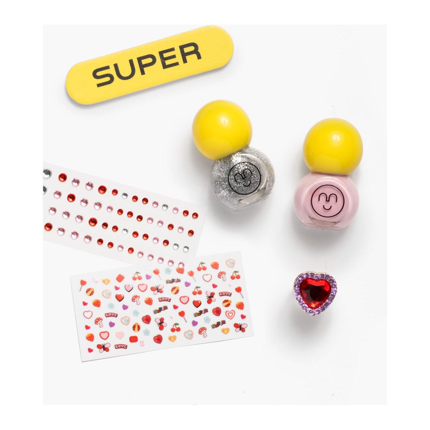 Fall in love with your nails this Valentine’s Day with the Make It Heartfelt Mini Nail Kit! This love-filled set includes two dazzling polishes—glittery silver and soft pink—plus adorable heart-themed stickers, shimmering nail gems, a handy nail file, and a red gem heart-shaped adjustable ring. Packaged in a cute, portable box with a handle, it’s everything you need to spread the love (and sparkle!) wherever you go.