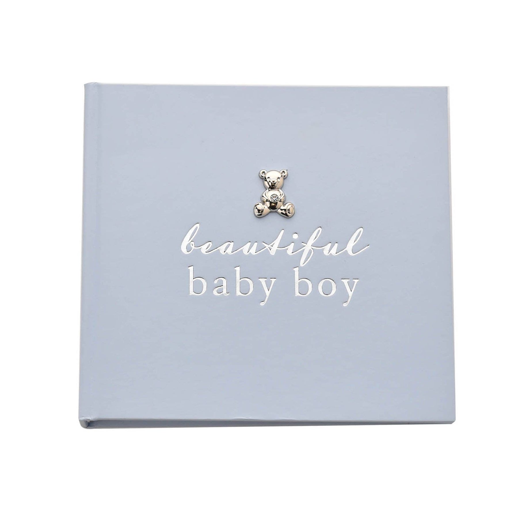 A photo album from BAMBINO BY JULIANA®. This adorable album allows parents to present photographs of their newborn son with a personalized touch. The album features a blue cover, complete with ‘Beautiful Baby Boy’ decal in silver foil debossed lettering and matching, silver metal teddy icon with clear set crystal. Inside is space for fifty photographs, blank space for annotations and personalized front page. The photo album is packaged in a presentation box.