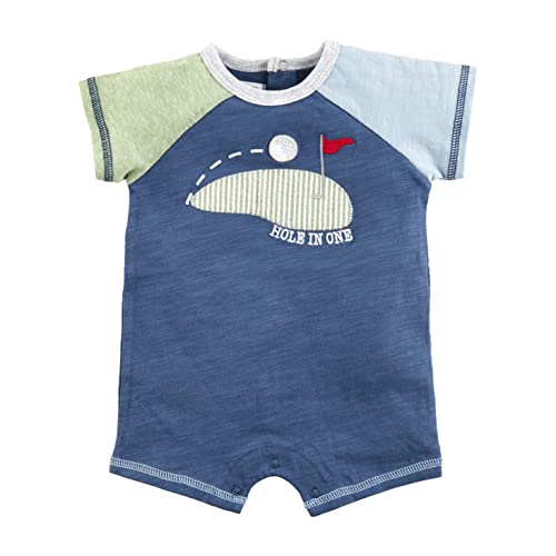 This Blue Golf Baby Shortall is a hole in one! The appliqued raglan shortall is made of cotton slub. The shortall features an inner leg snap closure. The shortall features a navy body with contrasting blue and green sleeves. The center of the shortall features a golf course image.