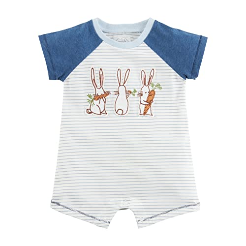 This Striped Bunny Baby Shortall is eggsactly what you're looking for this Easter! The appliqued cotton spandex shortall features raglan short sleeves. The striped shortall features an inner leg snap closure. The striped shortall features Easter bunny images in the center of the it.