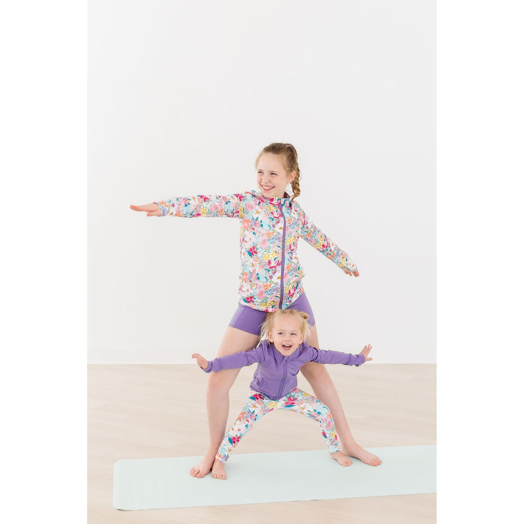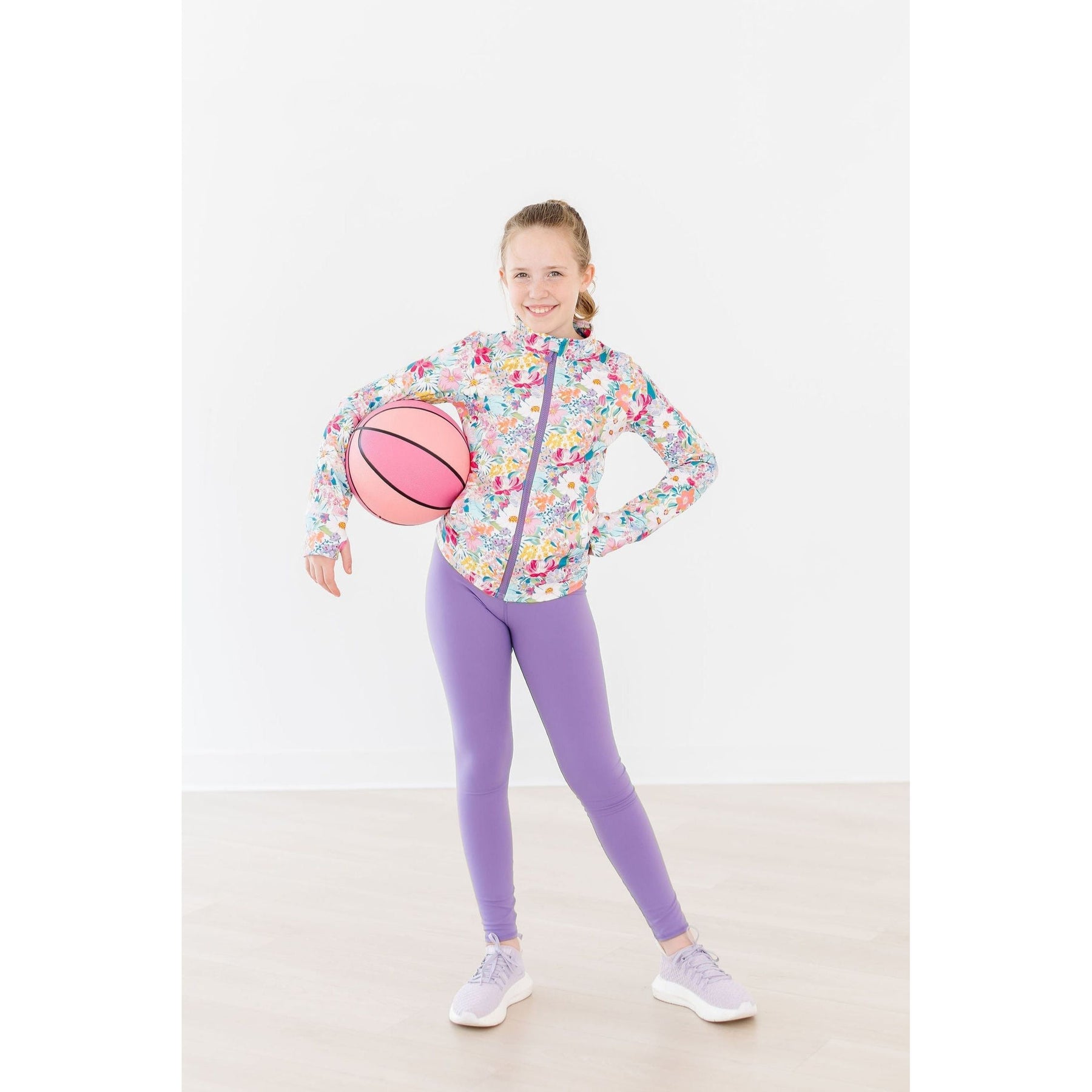It’s finally here! An active line made for dance, cheer, yoga workouts or just lounging at home. She will love the little details of this jacket like the ROSE on the zipper, thumbholes, and the ruffle on the back. And it has pockets! The line is made to mix and match or buy all 3 pieces in her favorite color in the shorty shorts and active legging.