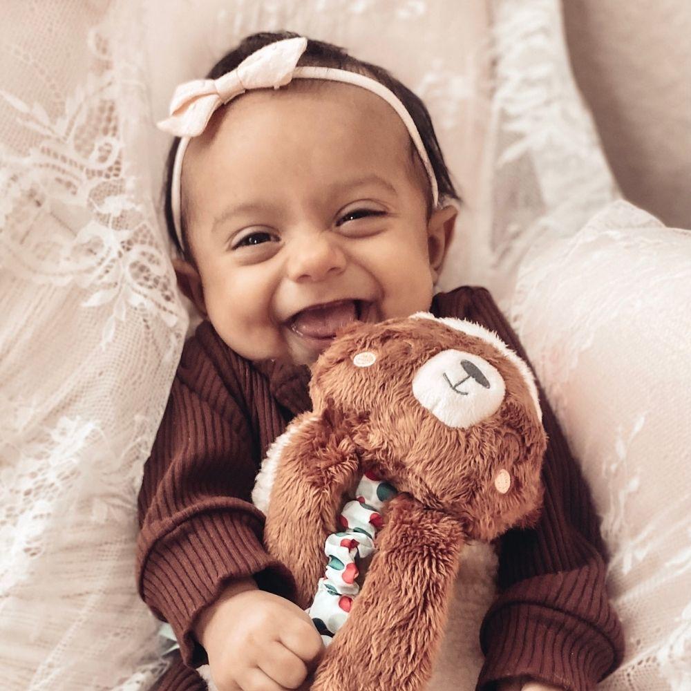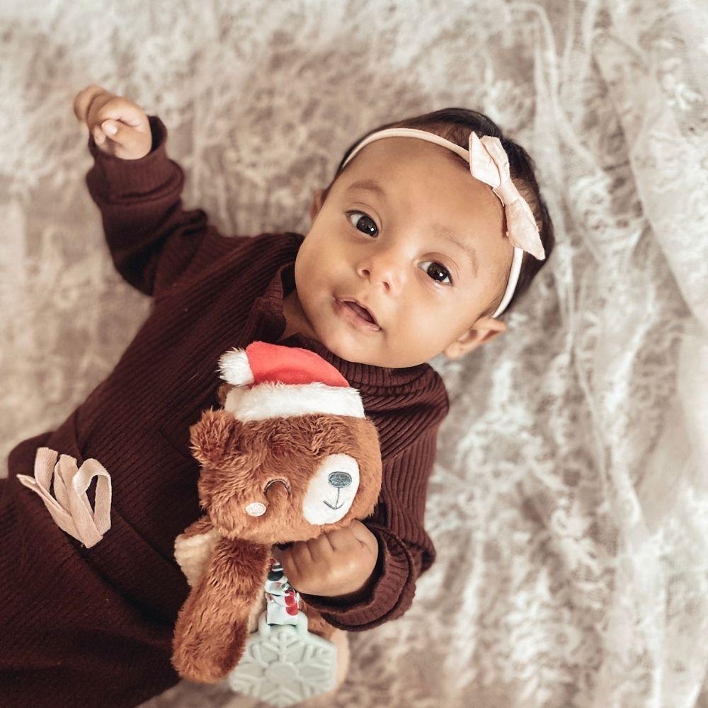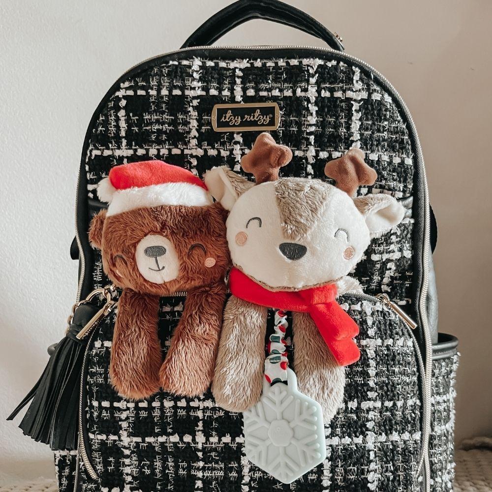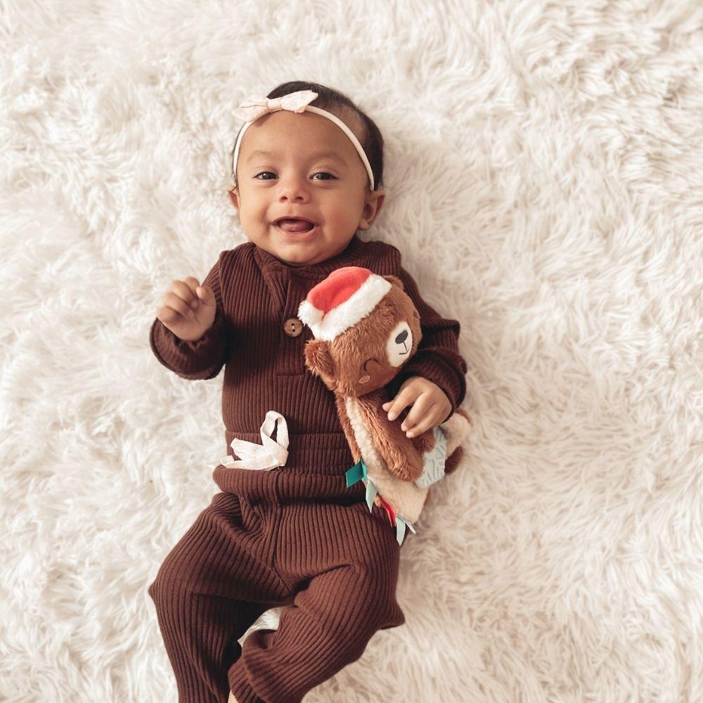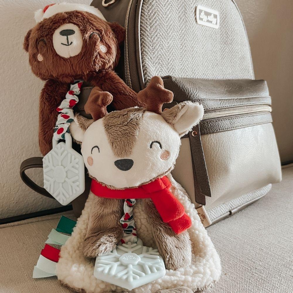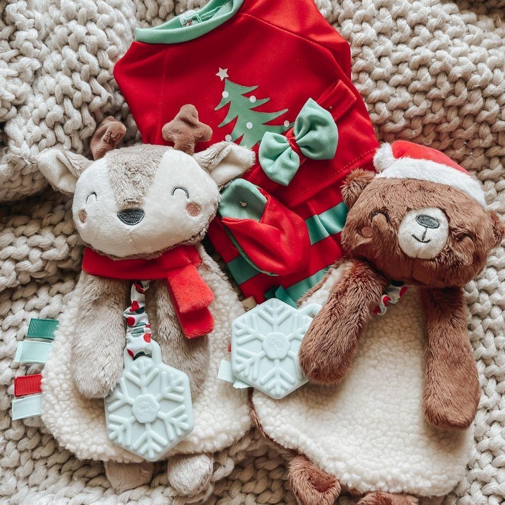 Snuggle and bond! Your little one is sure to love this cute holiday plush toy. Our Itzy Lovey™ is crafted with soft sherpa fabric and features textured ribbons that baby will love to explore! The arms include a crinkly fabric that’s sure to keep baby entertained with the gentle sound it produces. A textured snowflake teether is attached to help massage and soothe sore gums. Choose from different adorable characters including Santa, a penguin, and a cuddly teddy bear.