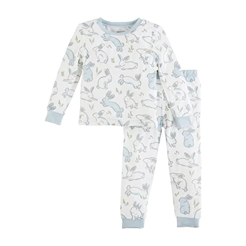 Hunt no further, the perfect Easter pajamas are here - our Blue Bunny Toddler Pajama Set. The two piece set comes with knit bamboo long pajamas. The pajamas feature a pink bunny pattern throughout with blue cuff details. These pajamas fit snug to comply with child safety regulations.