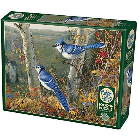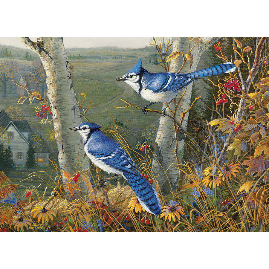 Two alert Blue Jays sit amongst the trees on a misty fall evening overlooking homes in the valley. A 1000 piece bird puzzle by Sam Timm.