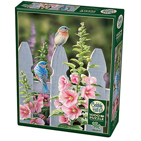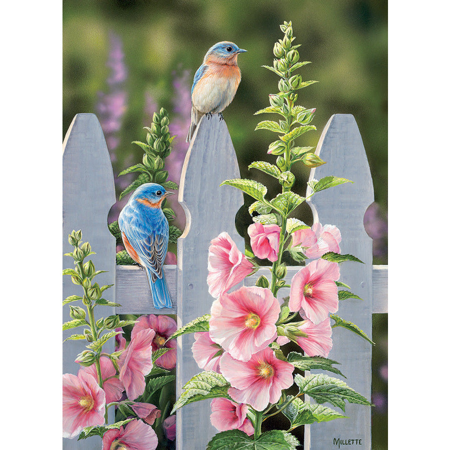 Bluebirds and Hollyhocks enjoy the white picket fence on a bright sunny day. This lovely 1000 piece puzzle pairs well with Rosemary Millette's Cardinals and Peonies as the white fence in the two puzzles will align next to each other when assembled, creating one complete look.
