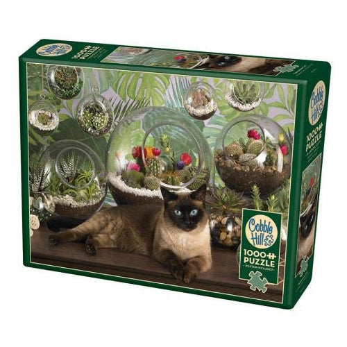 Tilly, the cute Terrarium Cat, enjoys her quiet spot in the house among the colourful succulents and the sun that beams in from the family room window.