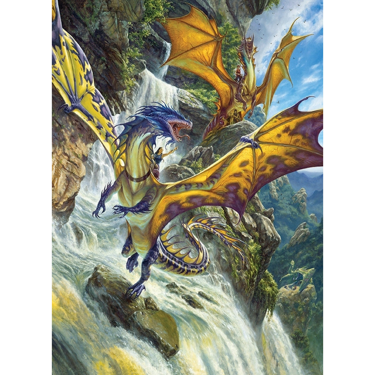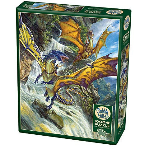 Princess Elysia of the Waterfall Dragons clan spots the enemy approaching. The roaring water isn't enough to halt her dragon's screeching alarm to warn the others on the cliffs below. They must protect these mountains from the Fire Dragons or ruin will come to all of Waterlandia. Your excitement will build as you work to complete this 1000 piece fantasy puzzle in all its magnificence!