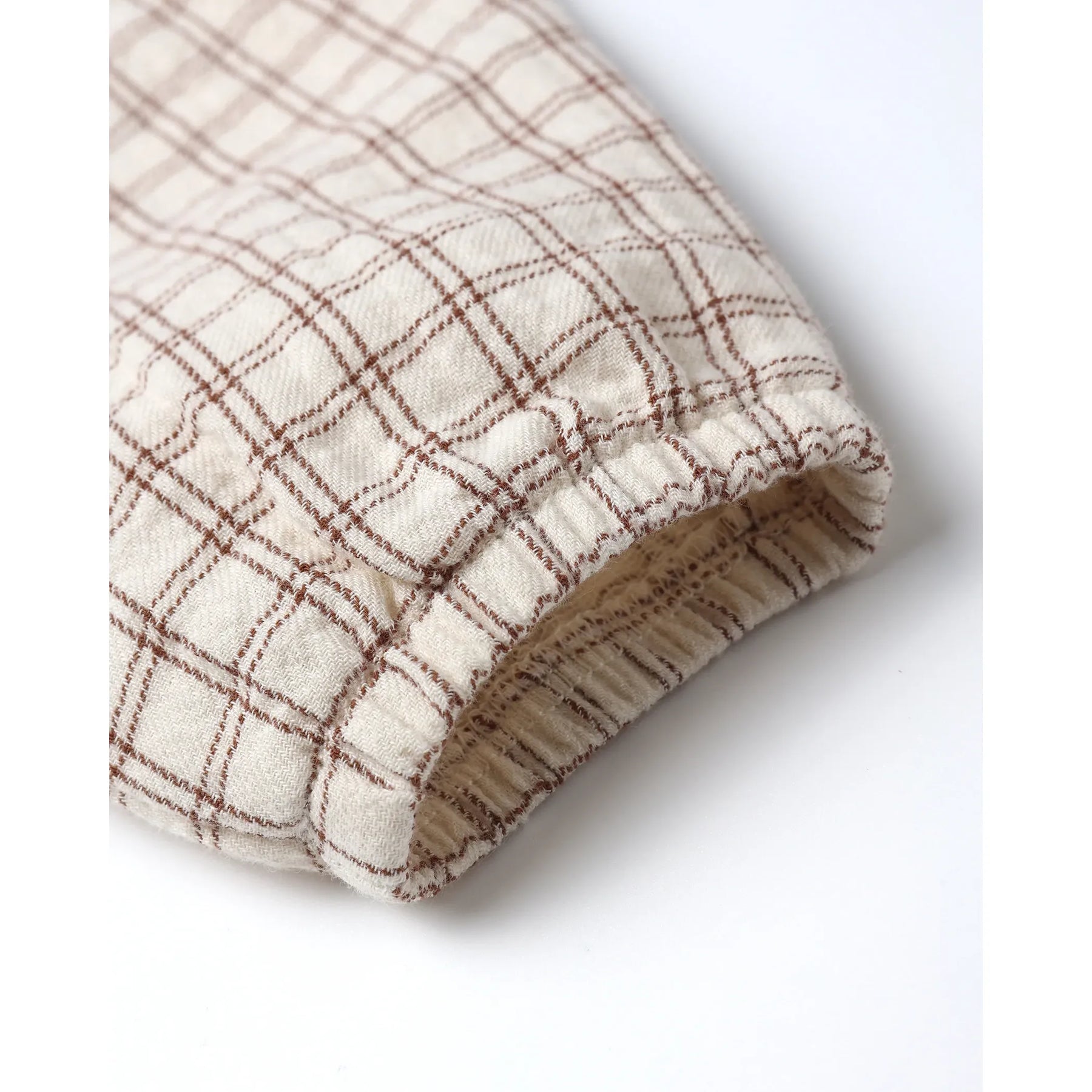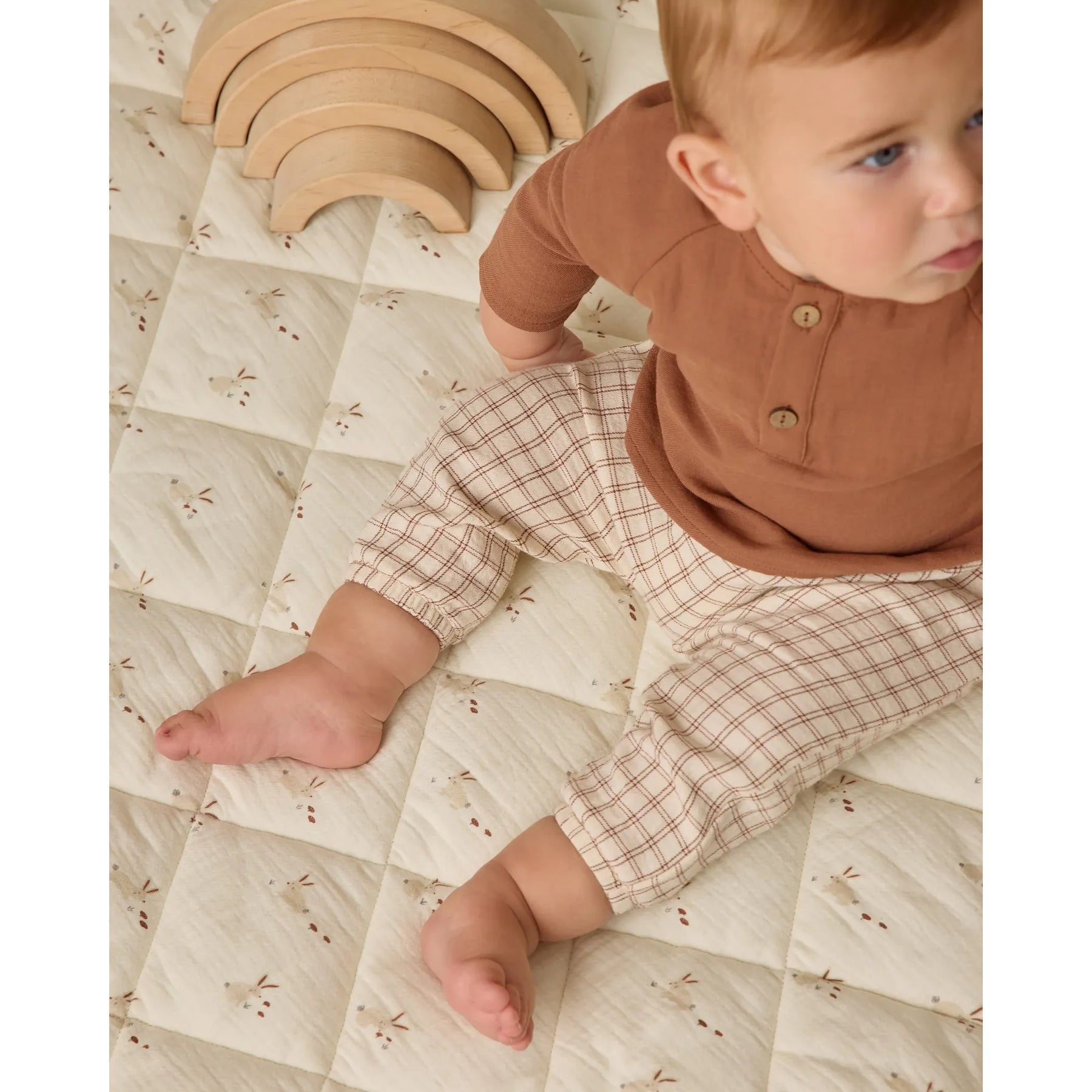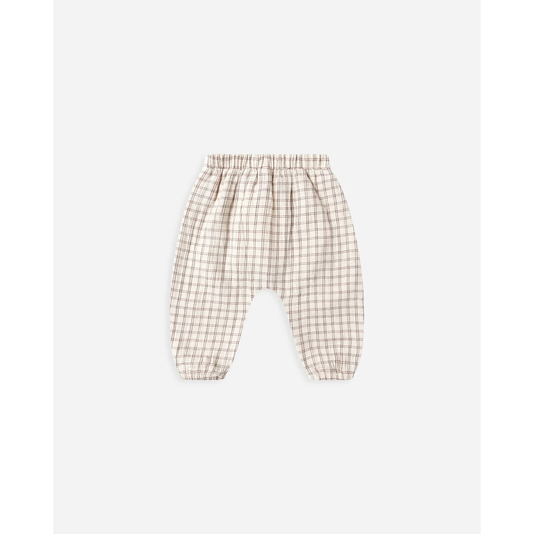Quincy Mae Woven Pant, Cedar Check. Woven pants with an elastic waistband and leg openings, designed with a dropped crotch for a relaxed, easy fit.