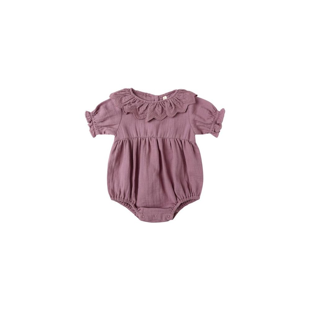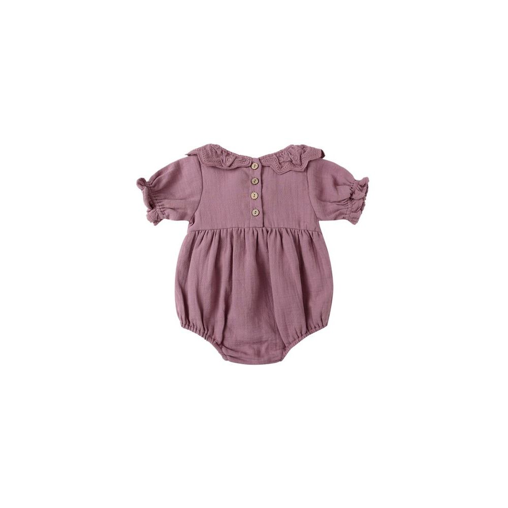 Quincy Mae Collared Romper, Mulberry. A sweet romper with a collar, short puff sleeves, and ruffle details, finished with back buttons and bottom snaps for easy changing.