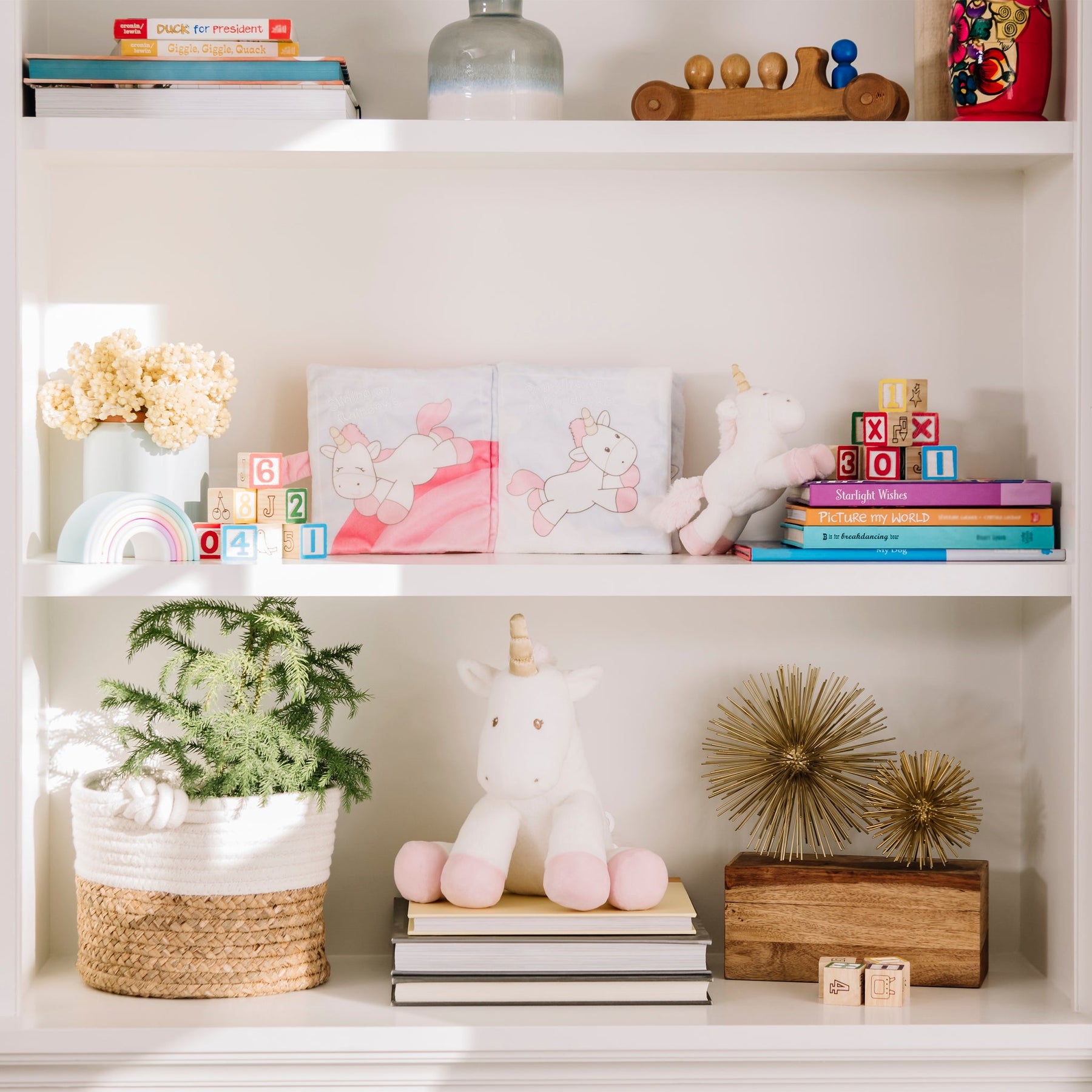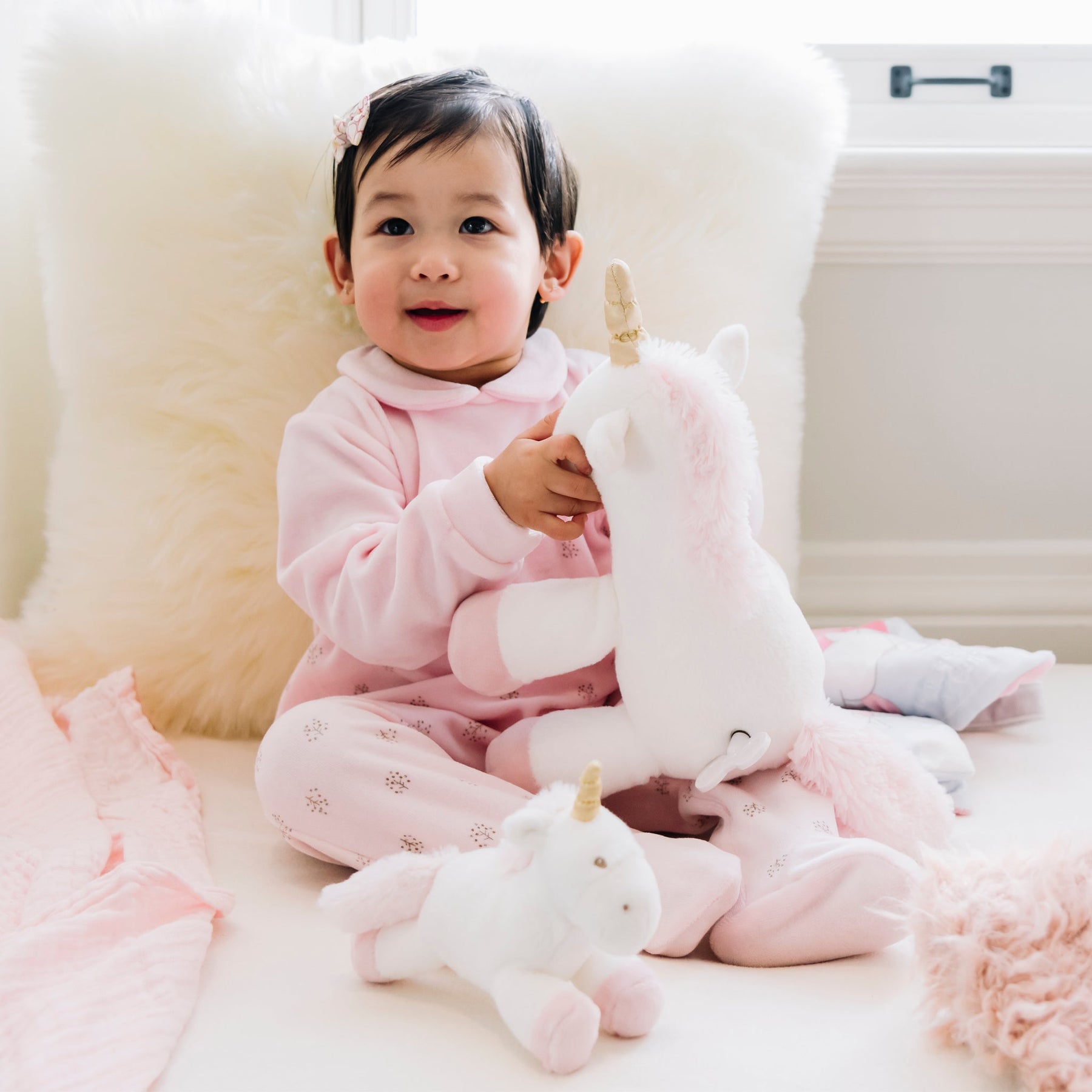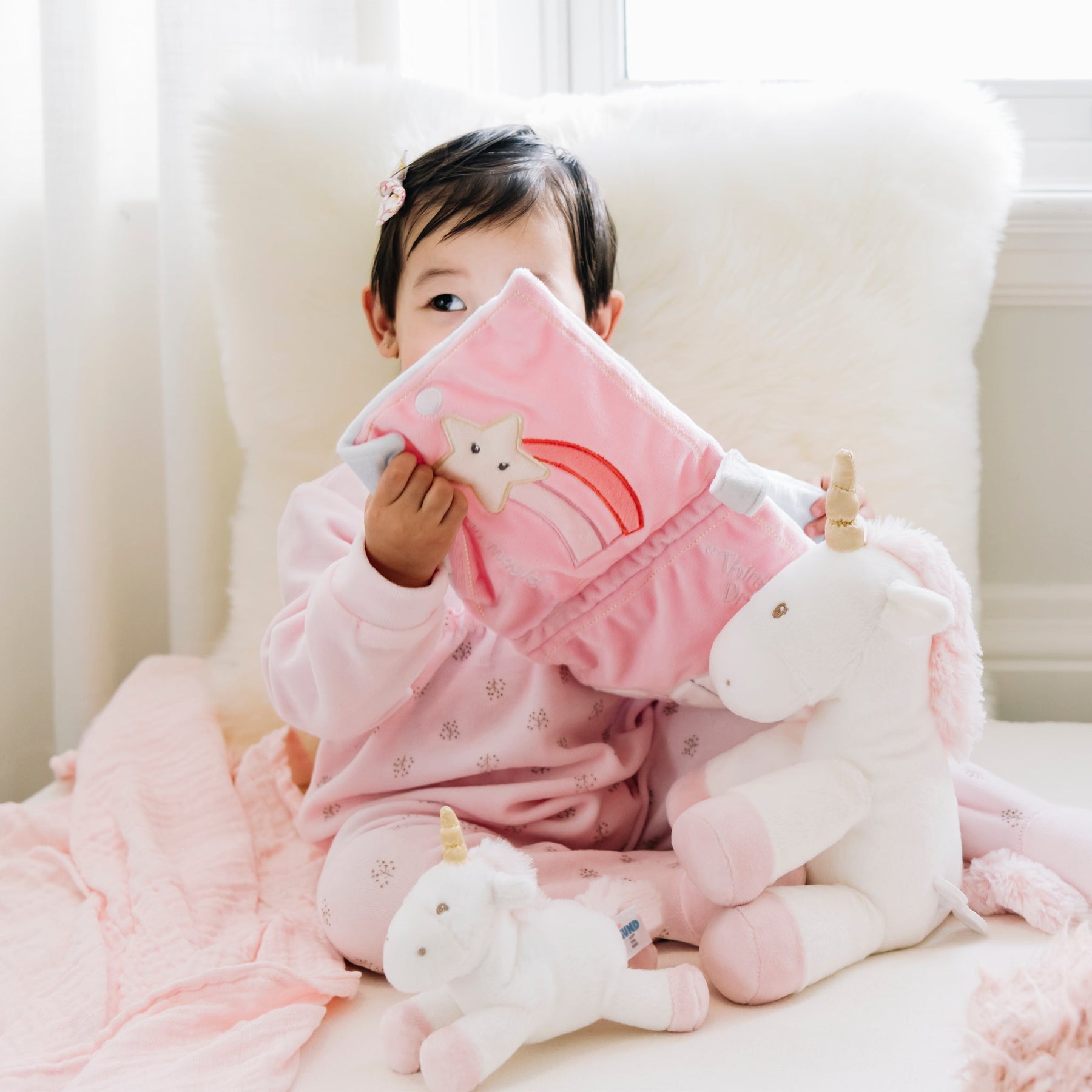 Luna the Unicorn is a sweet unicorn who makes playtime with baby magical! This 7-inch plush rattle format of Luna, with her signature pink mane and golden horn, makes pleasant rattling noises as baby plays for added interactive value and sensory input.