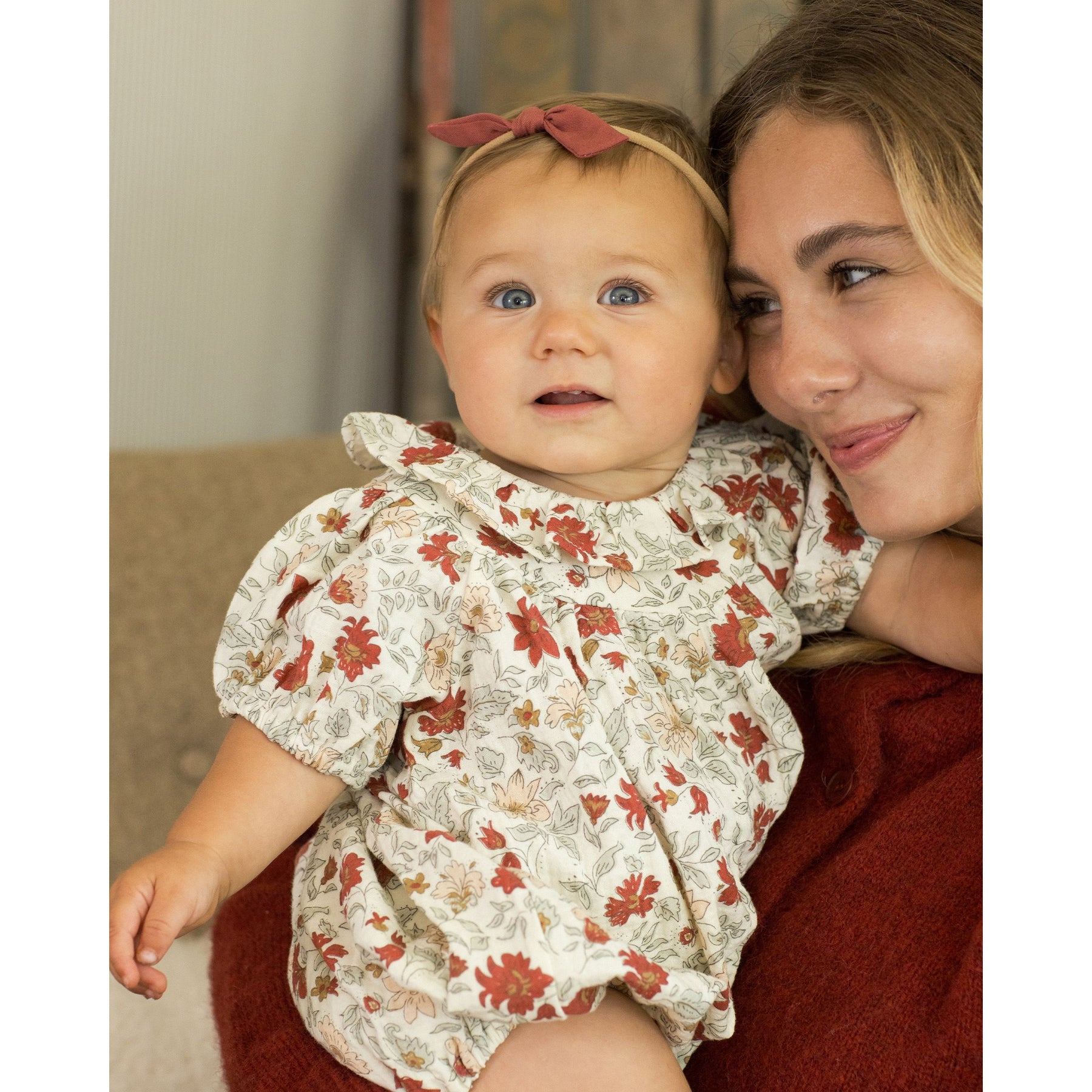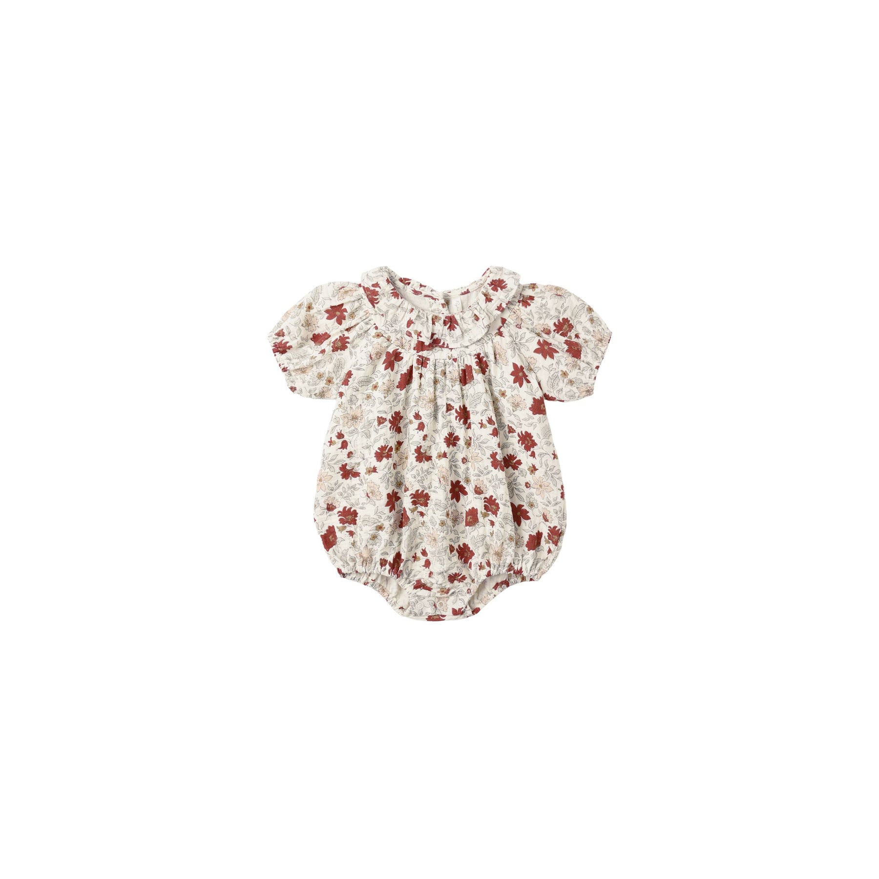 Bubble romper featuring elasticized sleeve openings and leg openings to create a bubble-like silhouette. Dainty ruffle along the neck and snaps along bottom opening.