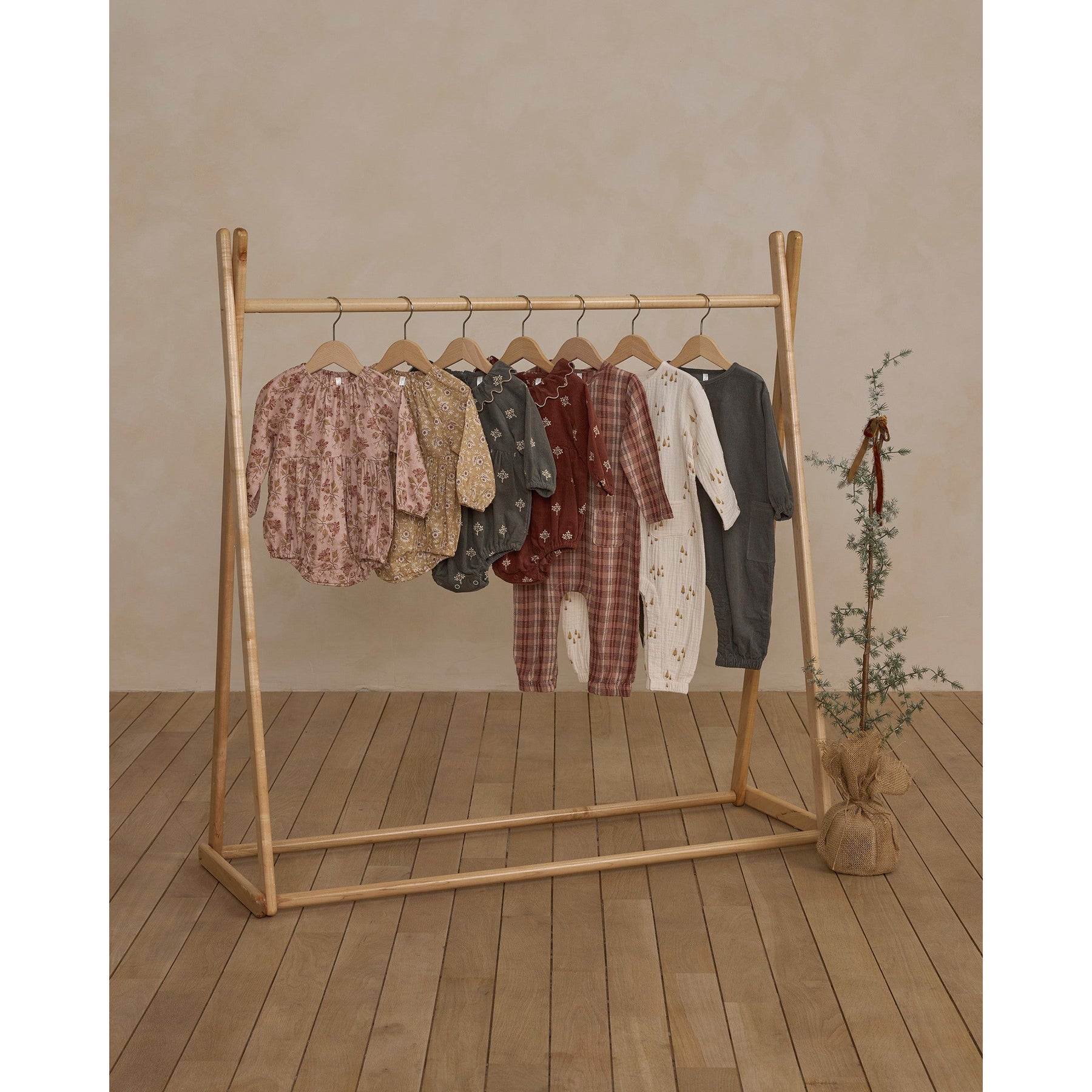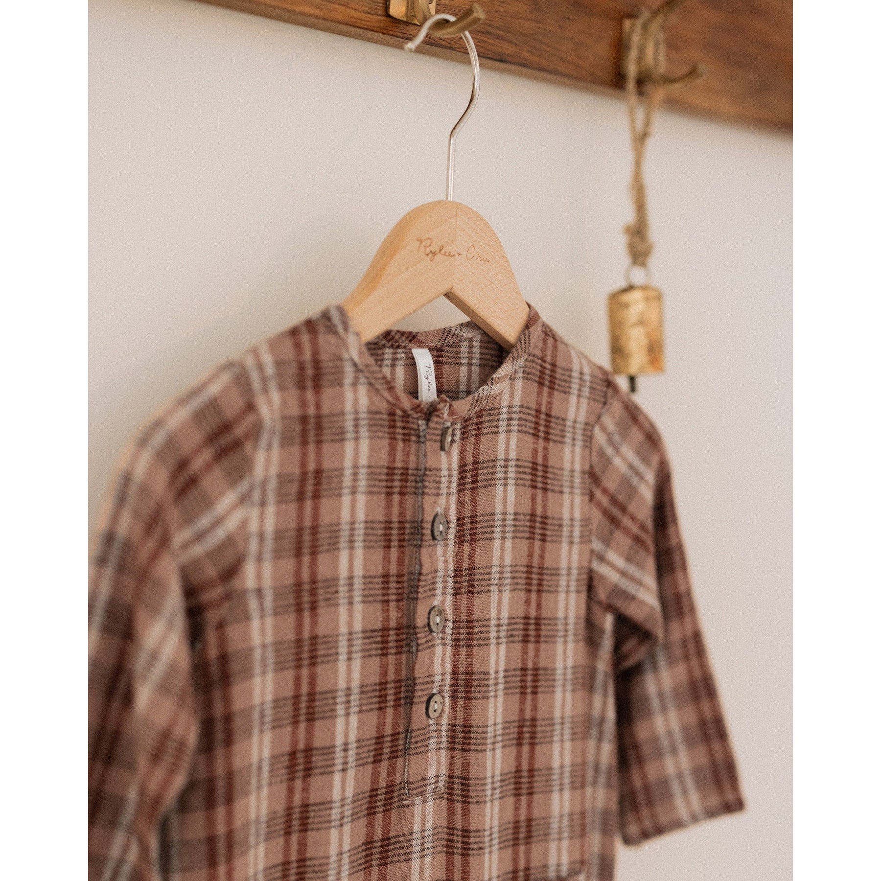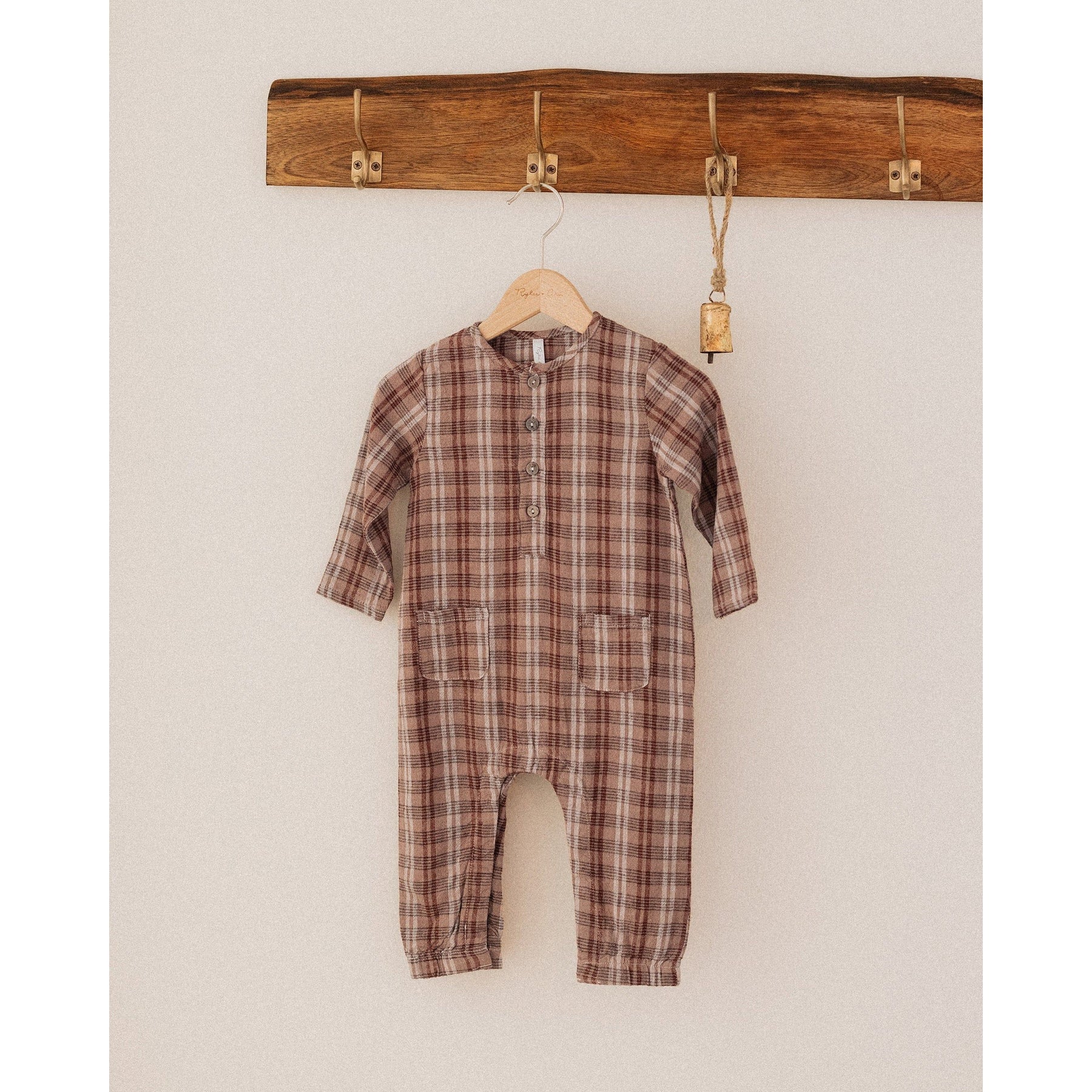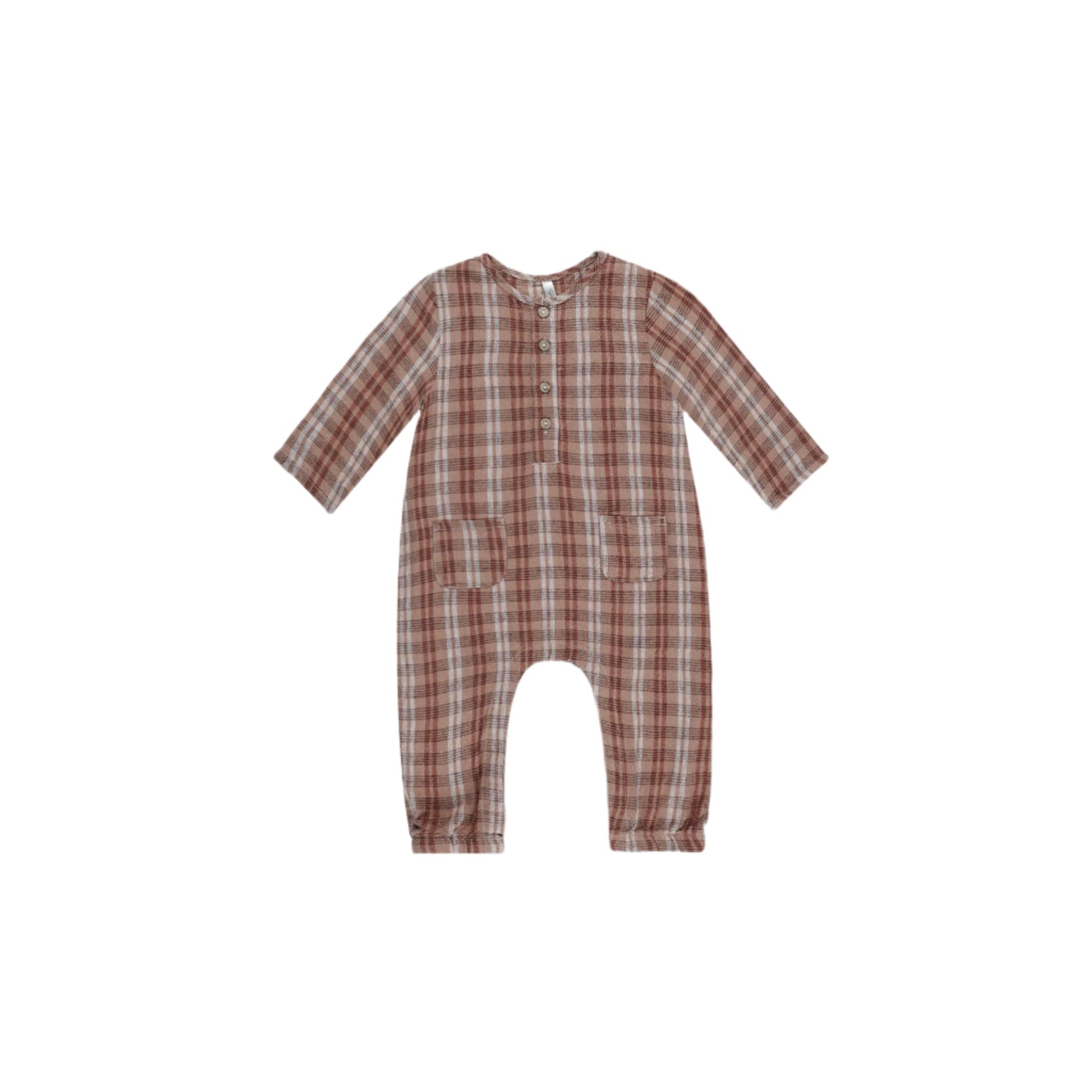 Long sleeve jumpsuit with coconut buttons down the chest, and hidden snaps along the inseam for easy changing. Elastic at leg openings for the perfect fit.