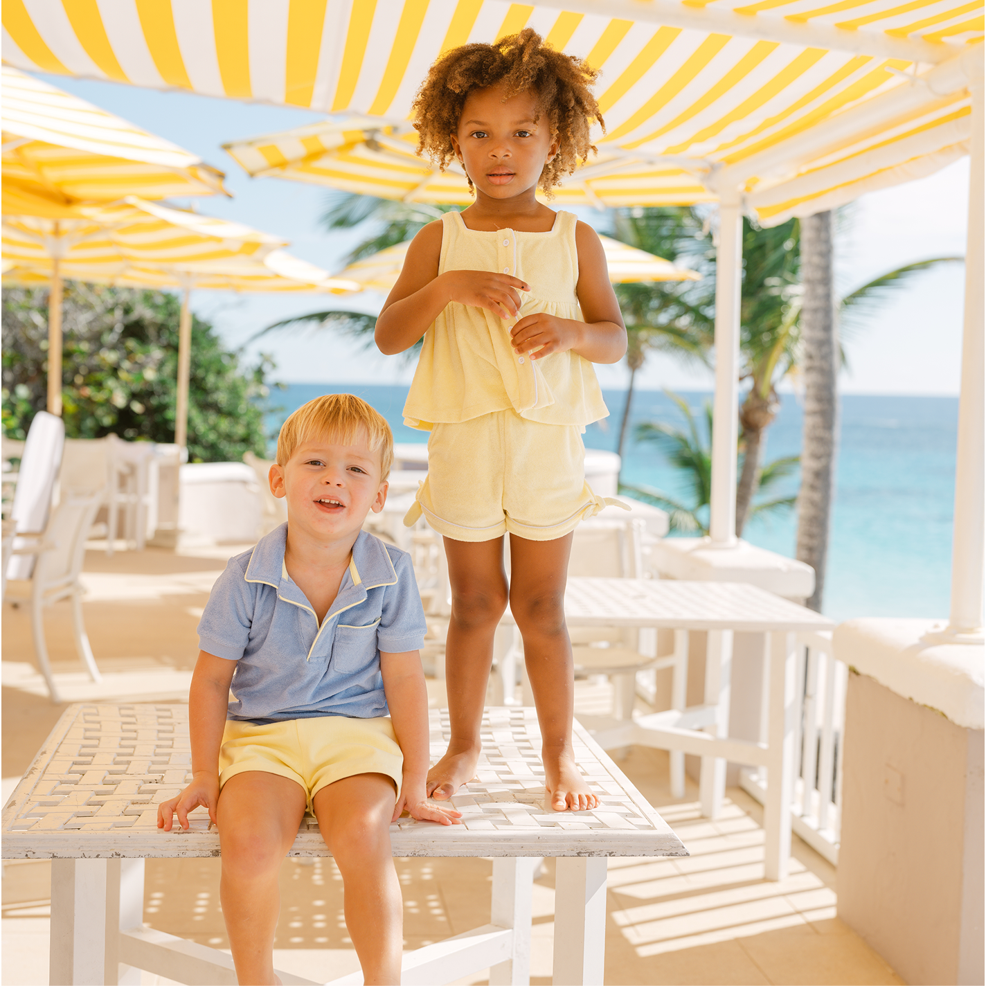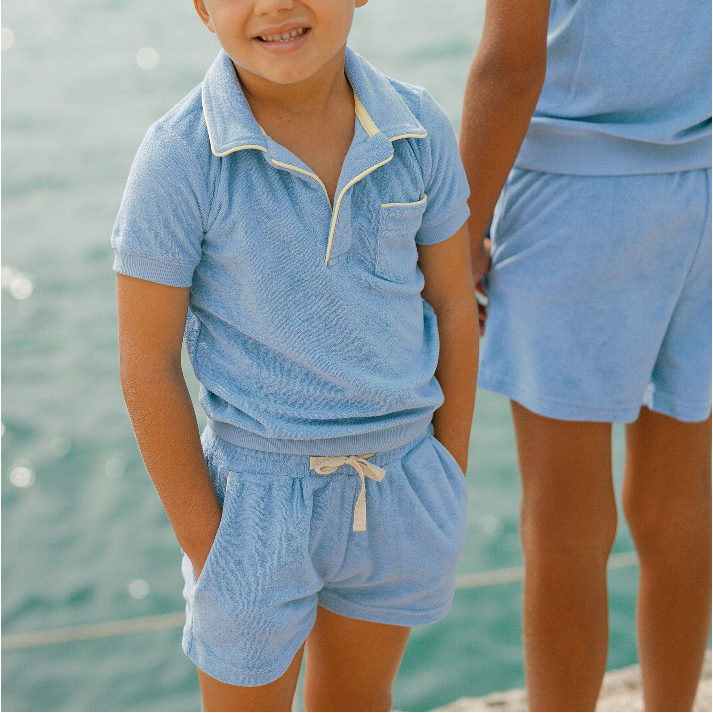 Made with our premium french terry, this cozy boy's polo shirt will seamlessly take your little from post-swim to playtime. featuring a classic collar, with new contrast piping details and a front pocket, this versatile shirt will quickly become a favorite they'll never want to take off.