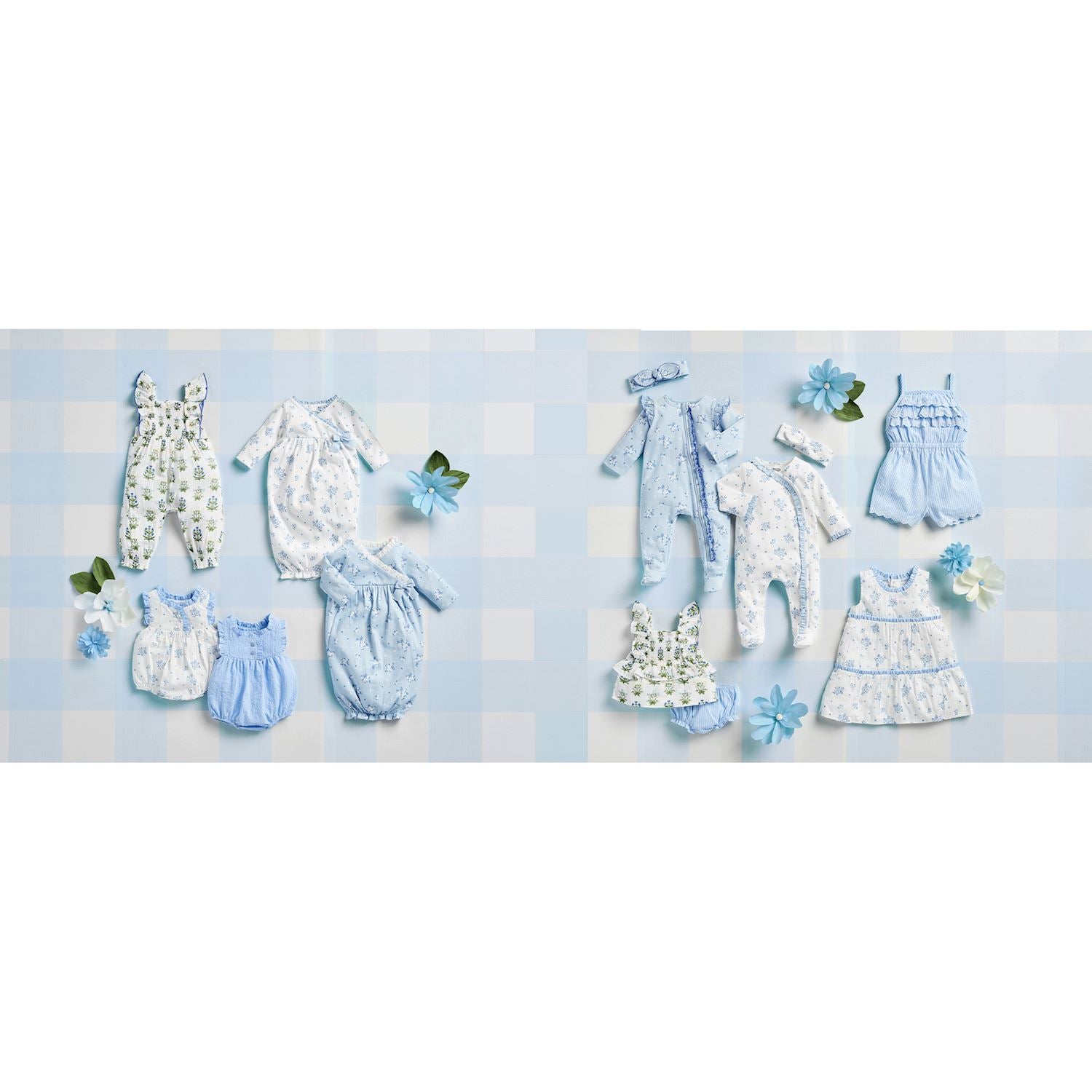 Woven stripe romper features eyelet embroidered chest ruffles and hem.