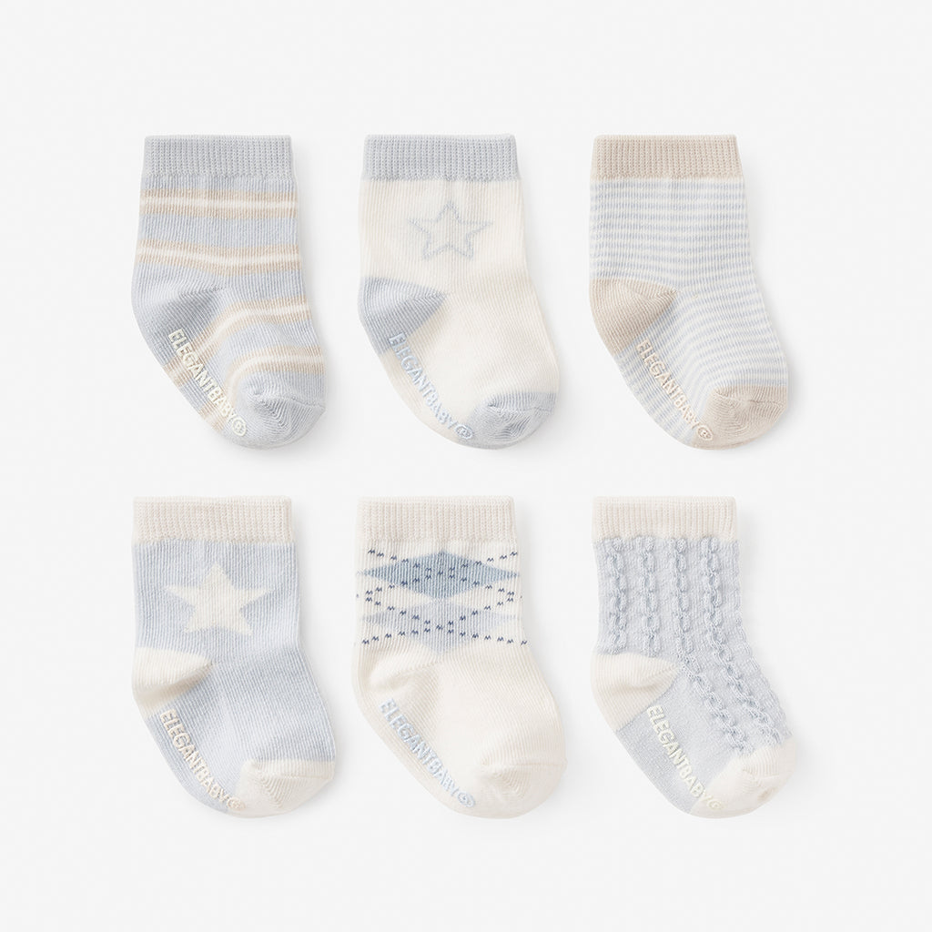 Made with the softest mix of cotton, nylon and spandex, this baby boy sock set features modern prints with a useful no-slip feature. Characters are thoughtfully designed to lay flat across the front of foot for visibility while baby is laying down ( yes, we think of all the details). Complete your baby gift set with these adorable, newborn necessities.