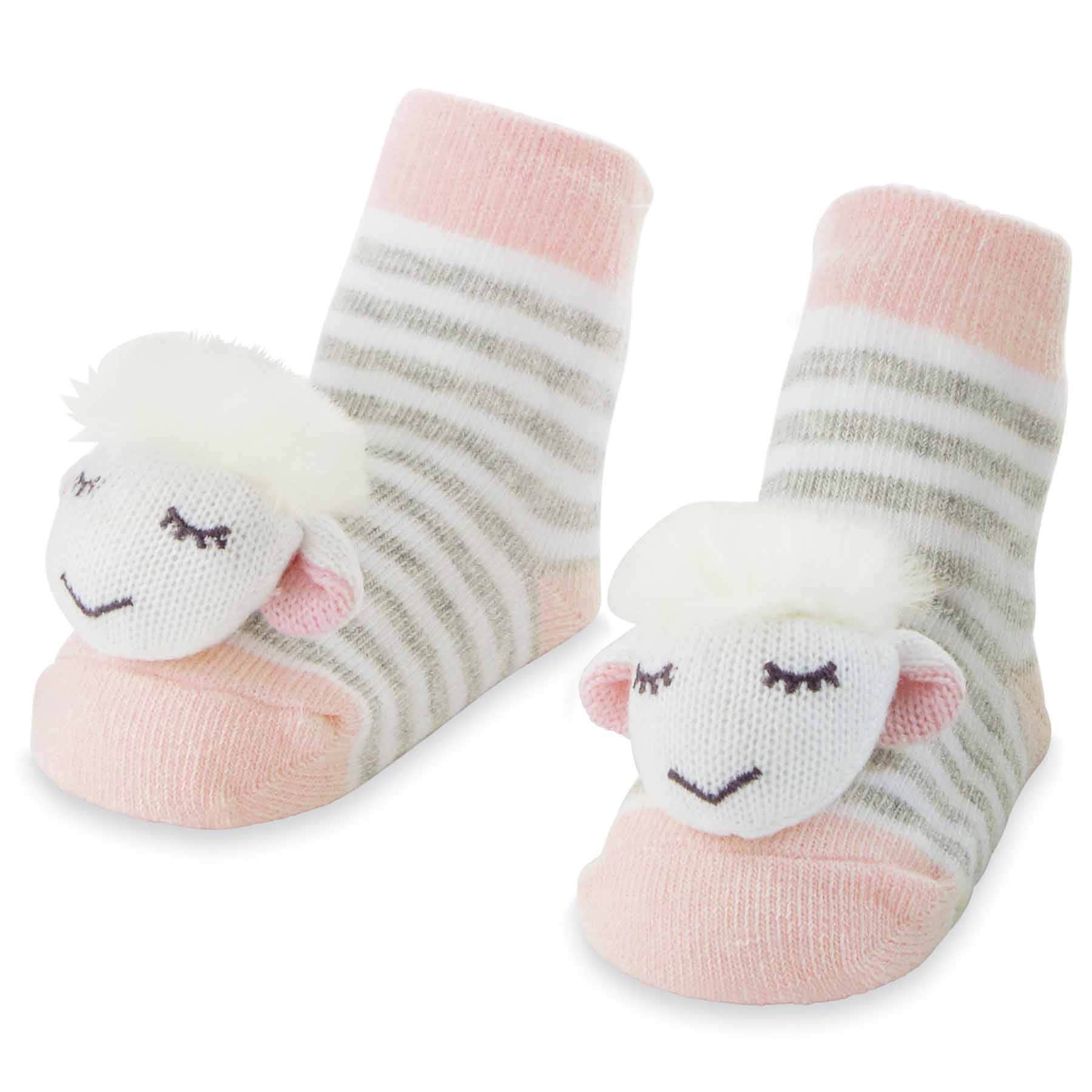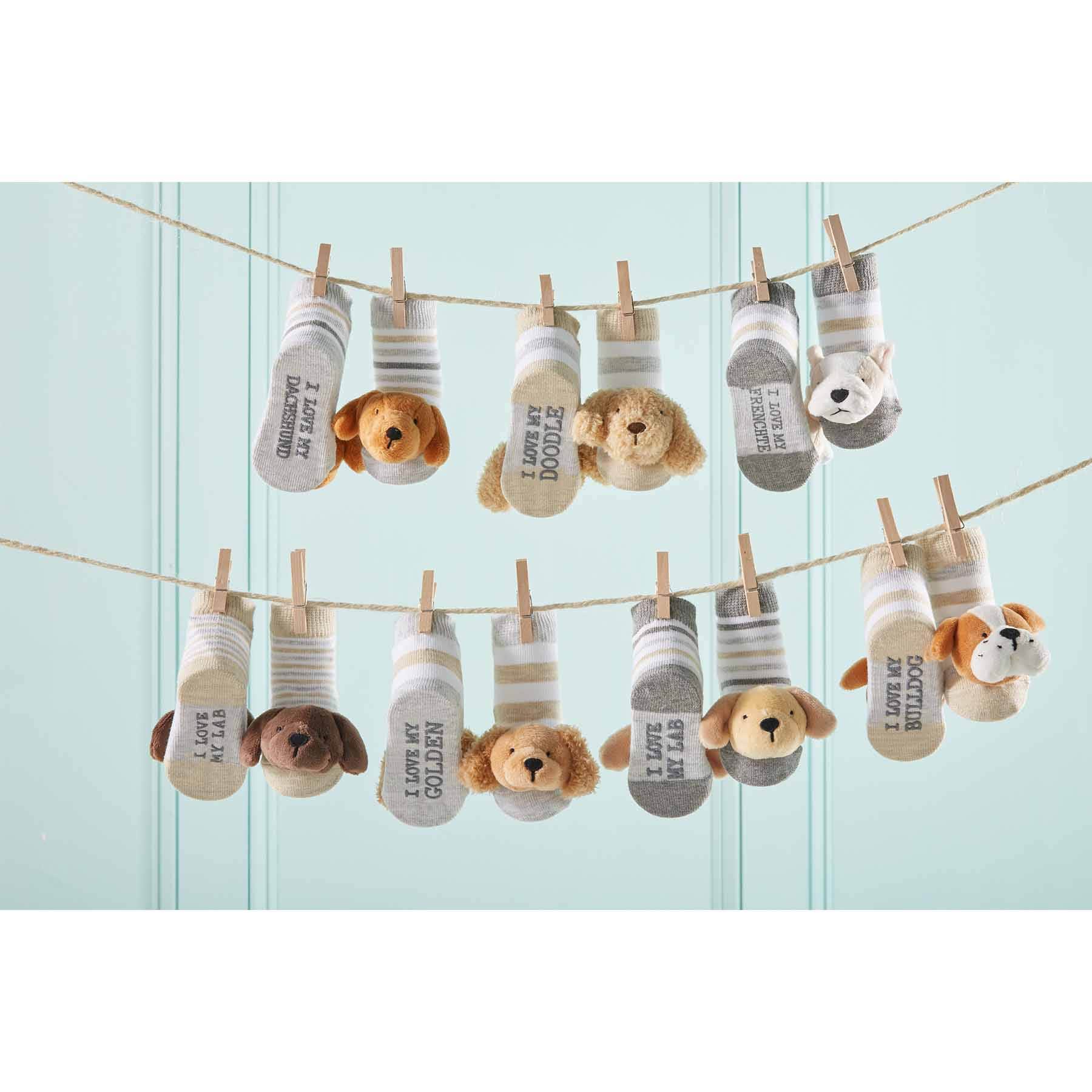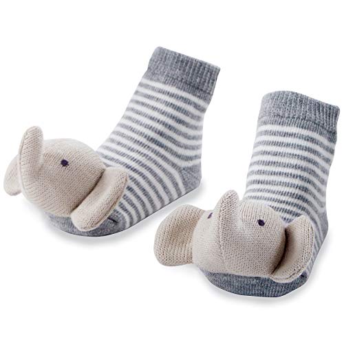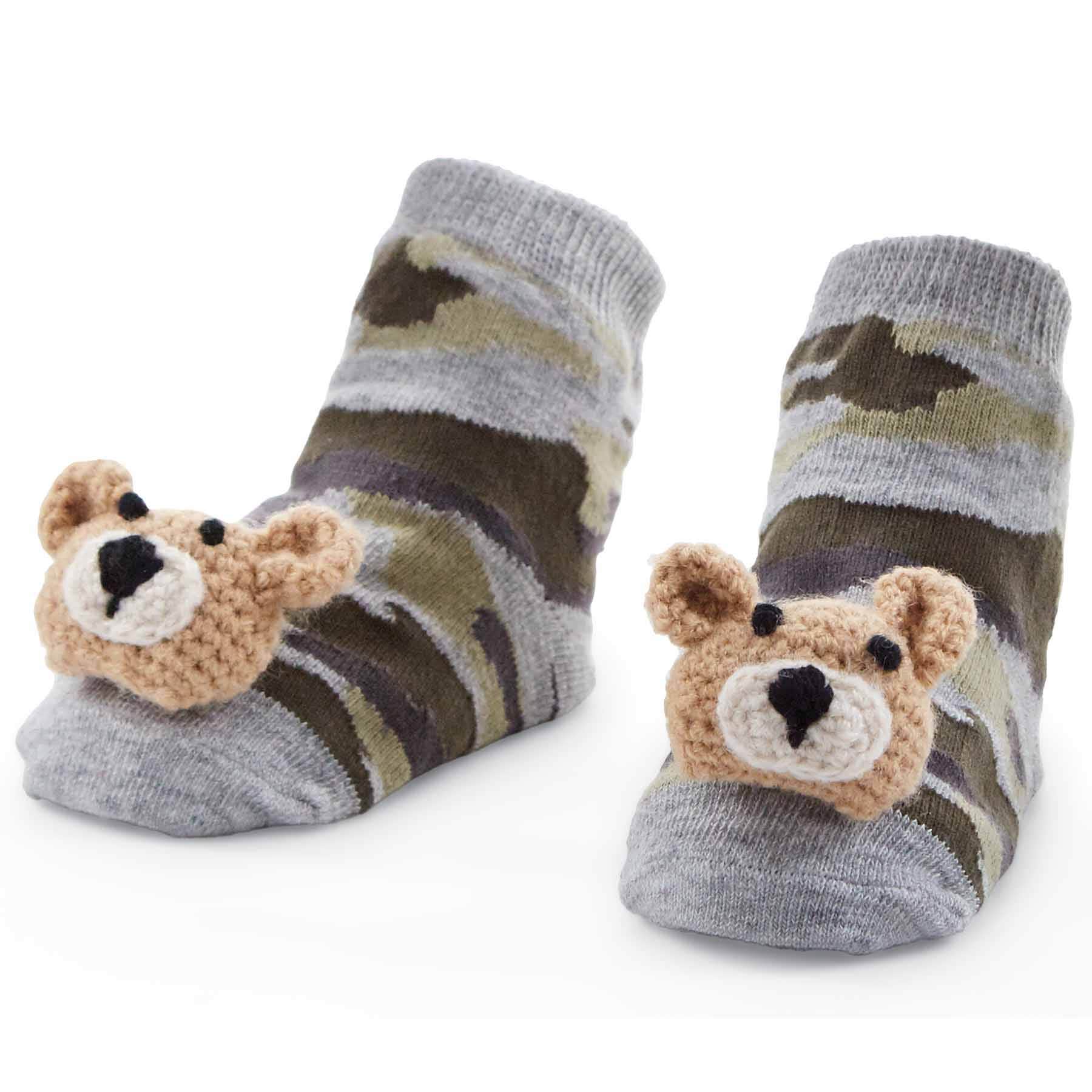 These rattle camo bear baby socks are great for baby! The rattle camo bear socks feature a camo pattern and sweater knit bear rattles at toes. The camo pattern features a green and gray coloring. The end of the socks feature a brown bear. The toes and heels feature contrasting heels and toes.
