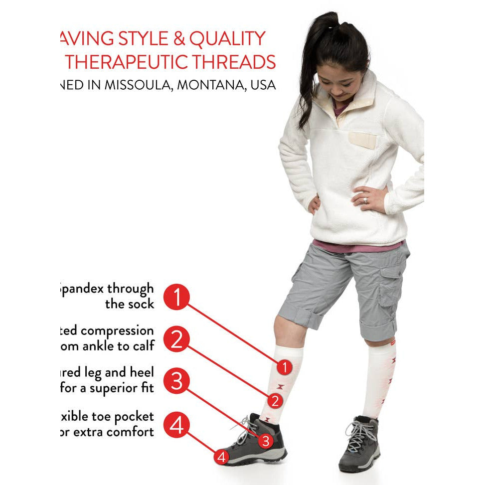 Made with premium cotton and 200-needle count for flexibility and comfort. Our socks offer moderate-firm compression (20-30 mmHg). 20-30 mmHg is considered medical-grade compression and generally recommended or prescribed by your doctor. This design also comes in a lower compression level of 15-20 mmHg. Compression level: 20-30 mmHg Material: 48% Cotton, 42% Nylon, 10% Spandex (Latex-free) Designed in Missoula, MT. Made in Taiwan.