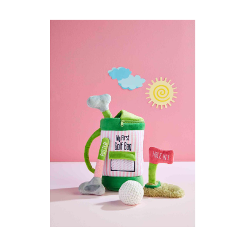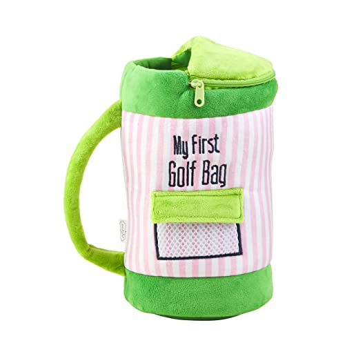 5-piece set: plush golf bag holds plush driver, putter, rattle golf ball and hole with flag.
