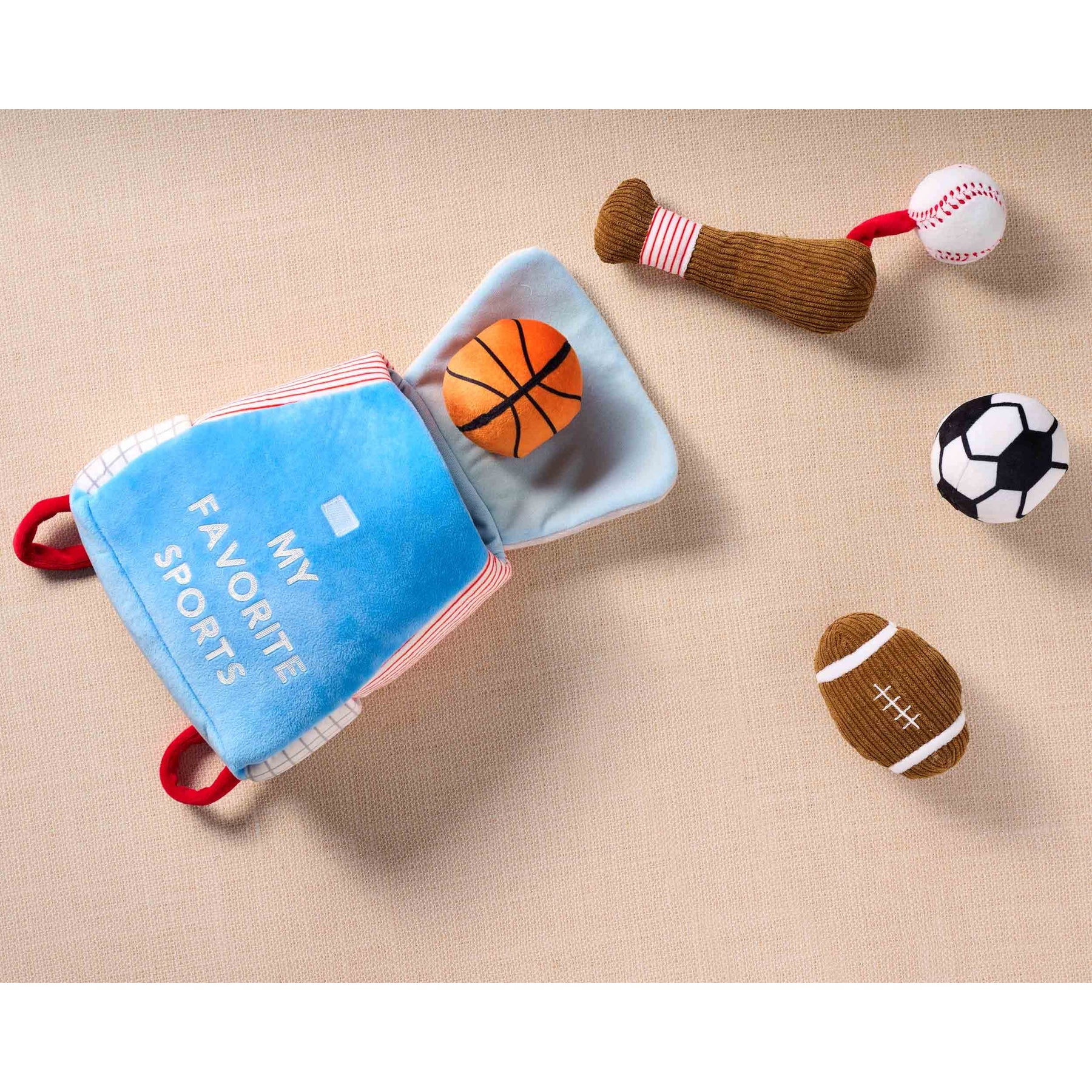 Take me out to the ball game, packed up in this soft and easy to carry My Favorite Sports Plush Toys backpack. The five piece set comes with an interactive so-soft plush backpack. The backpack holds four rattle and crinkle sensory plush sport balls and bat for hours of imaginary play.