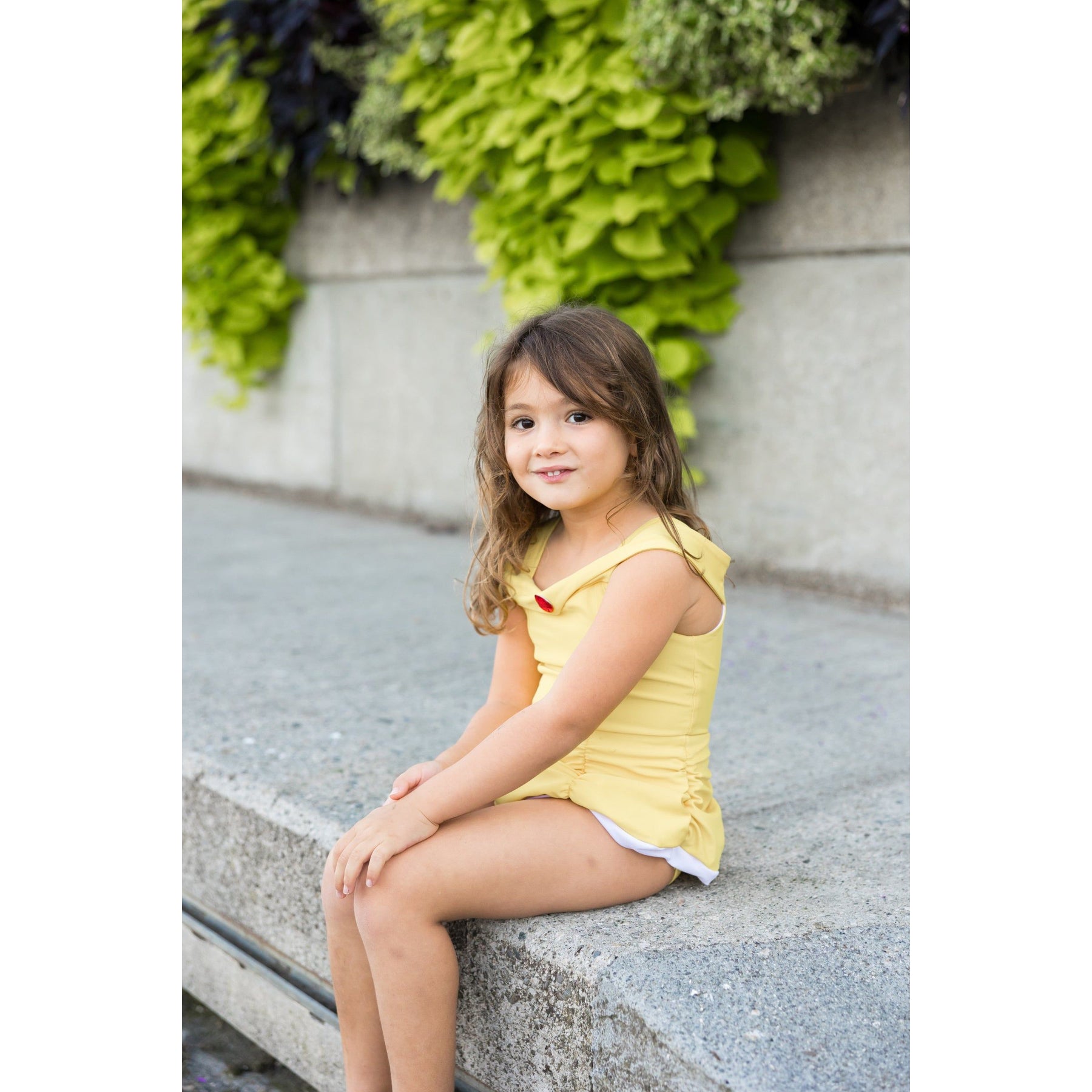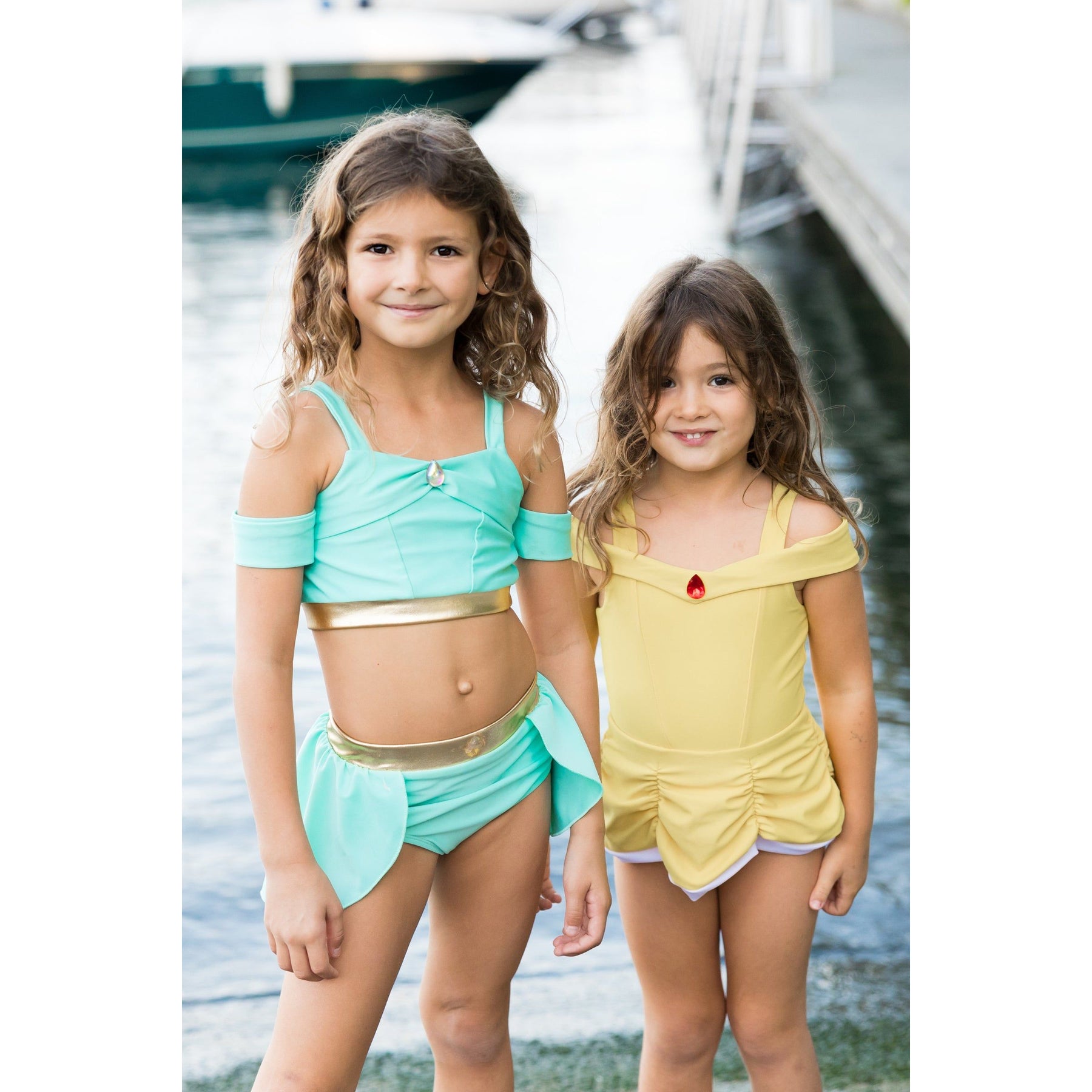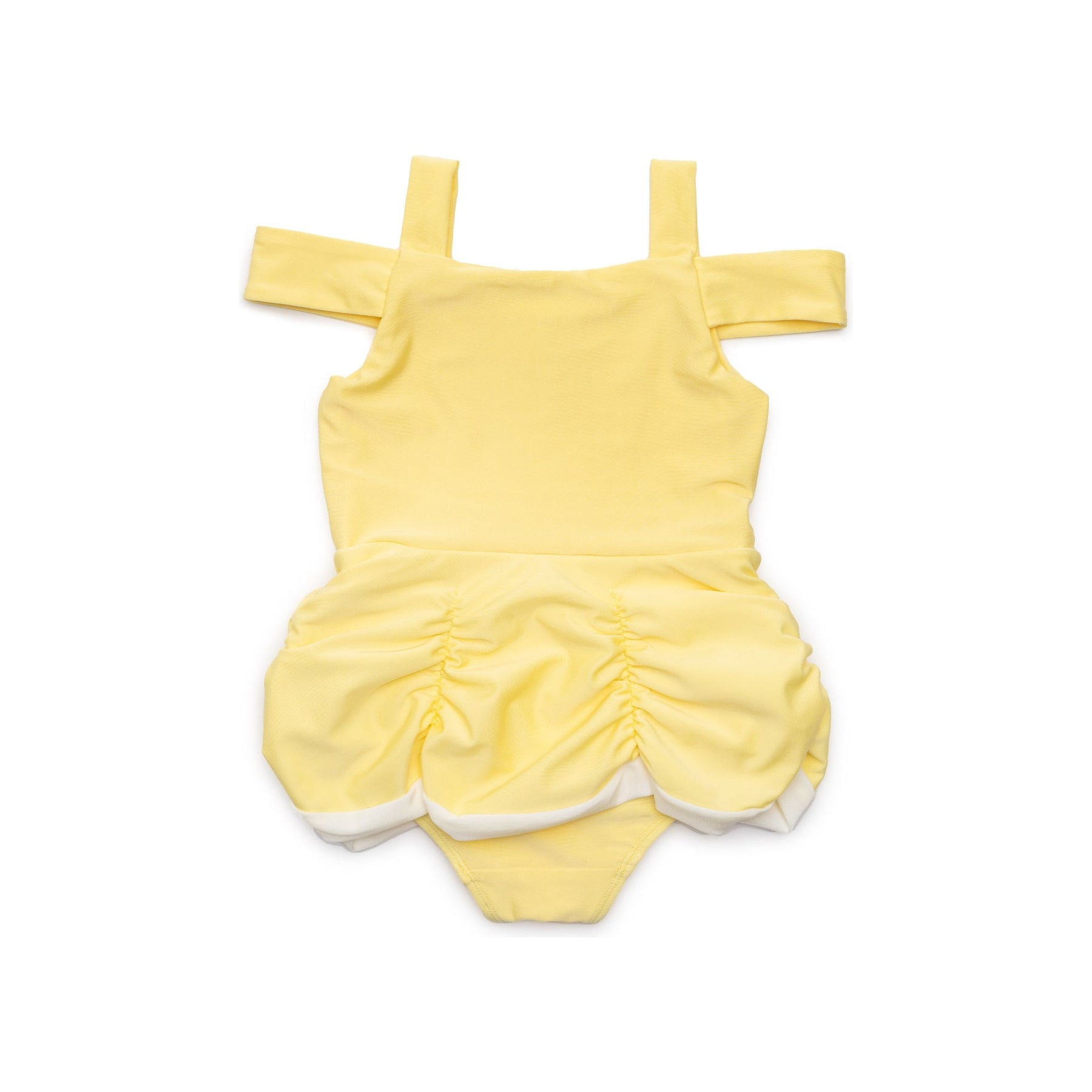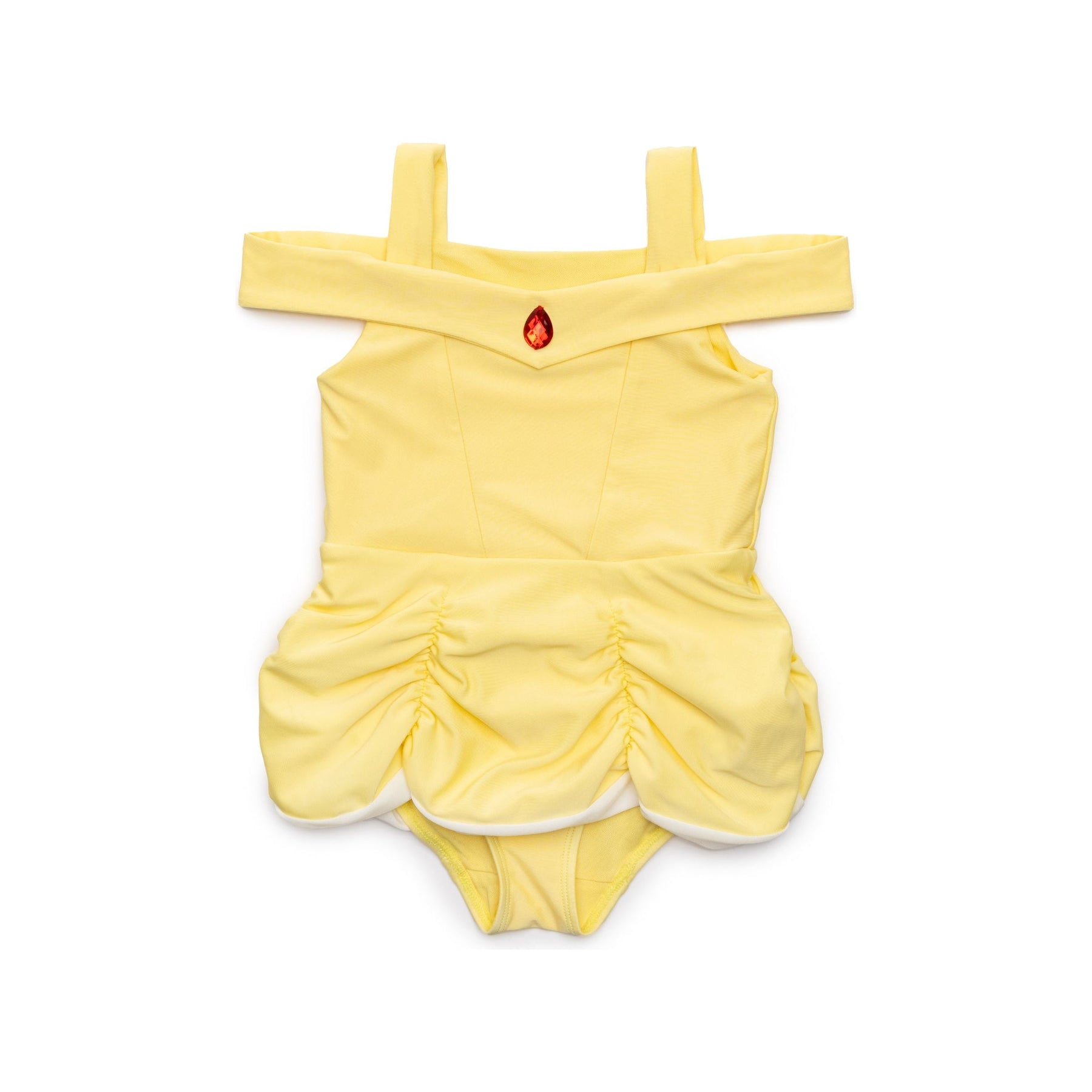 The one-piece swimsuit features a cheerful yellow hue, reminiscent of Belle's iconic ball gown. The top is adorned with an off-the-shoulder detail that mirrors the princess's regal charm, while the neckline showcases a dainty rose embellishment, a nod to the enchanted rose in the classic tale. The one-piece is made with a scalloped skirt-like bottom to resemble Belle's beautiful gown.