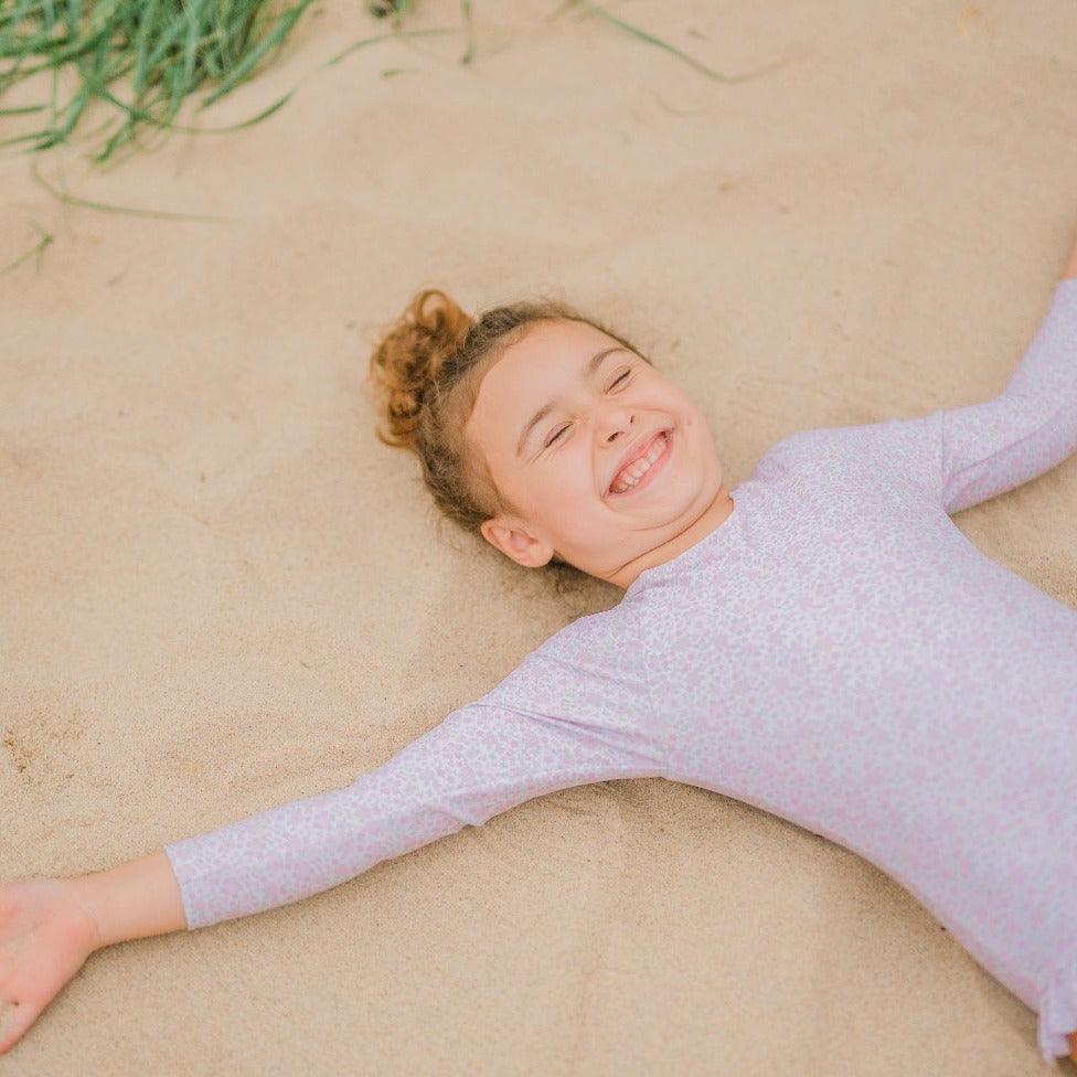 Our rashguard has been reimagined into an ultra-sweet one piece with a chic grosgrain ribbon tie back and feminine ruffle hip detail. in our buttery soft fabric with custom print, this long sleeved one piece is fully lined except for the sleeves to allow for movement and breathability. designed for a complete look in one with UPF protection, this piece will help to keep your littles sun-safe.
