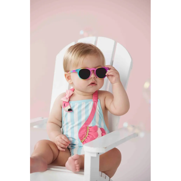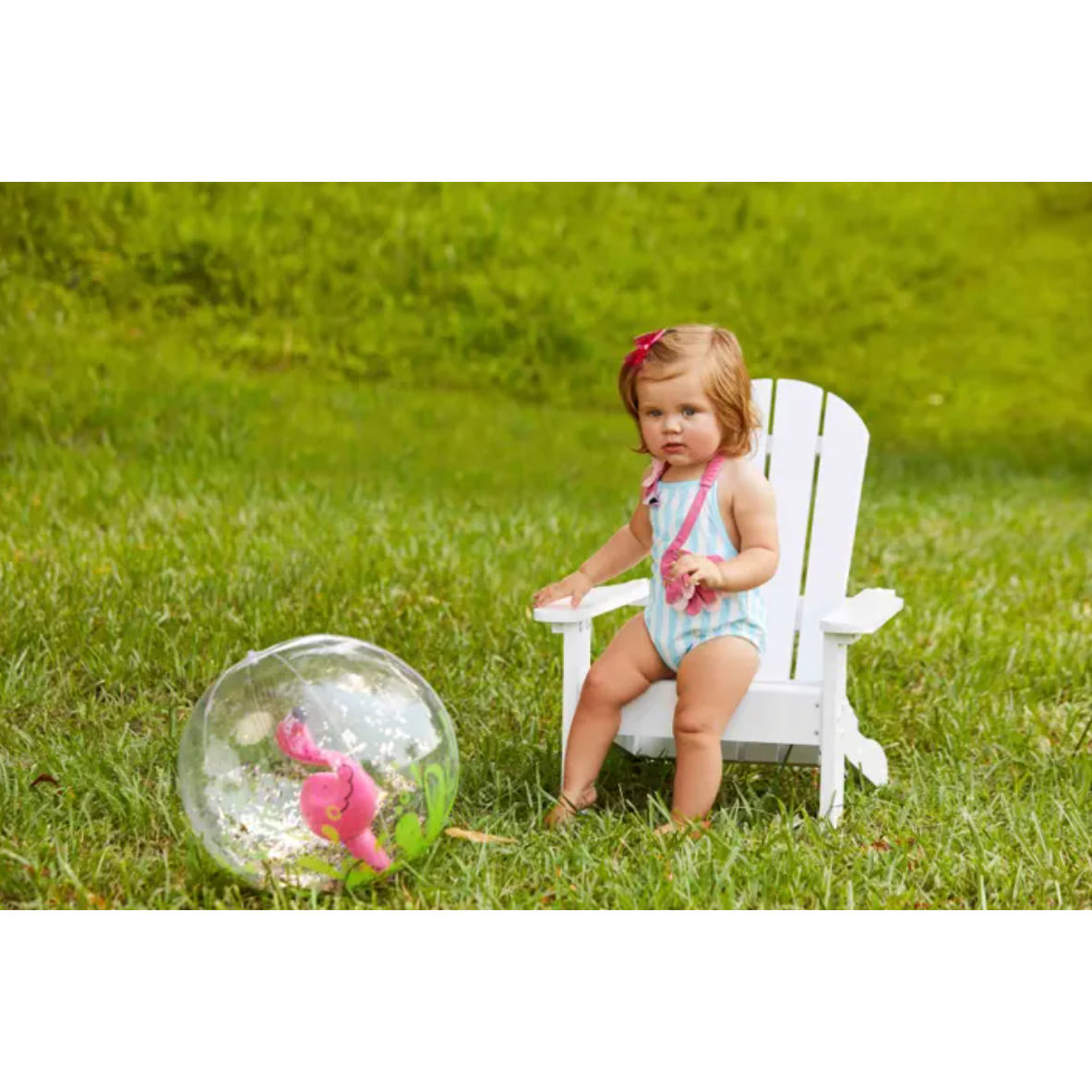 This Little Girl's Flamingo Swimsuit is our summer crush. The nylon spandex one-piece swimsuit features flamingo applique neck strap. The background of the swimsuit features a blue and white striped pattern. The swimsuit features dimensional flamingo details with pink coloring.