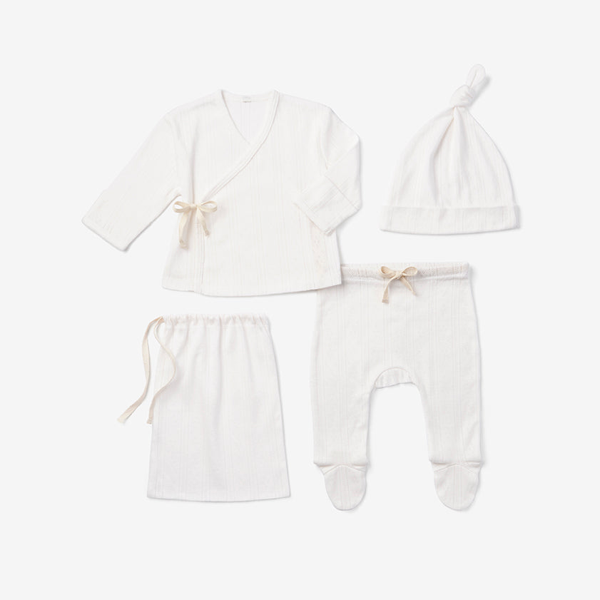 A collection of luxury newborn essentials that are almost as dreamy as that new baby smell. Make a little one's homecoming extra special with this four-piece layette set of super-soft, elegant pointelle knit outfit, packaged in a re-usable drawstring bag.