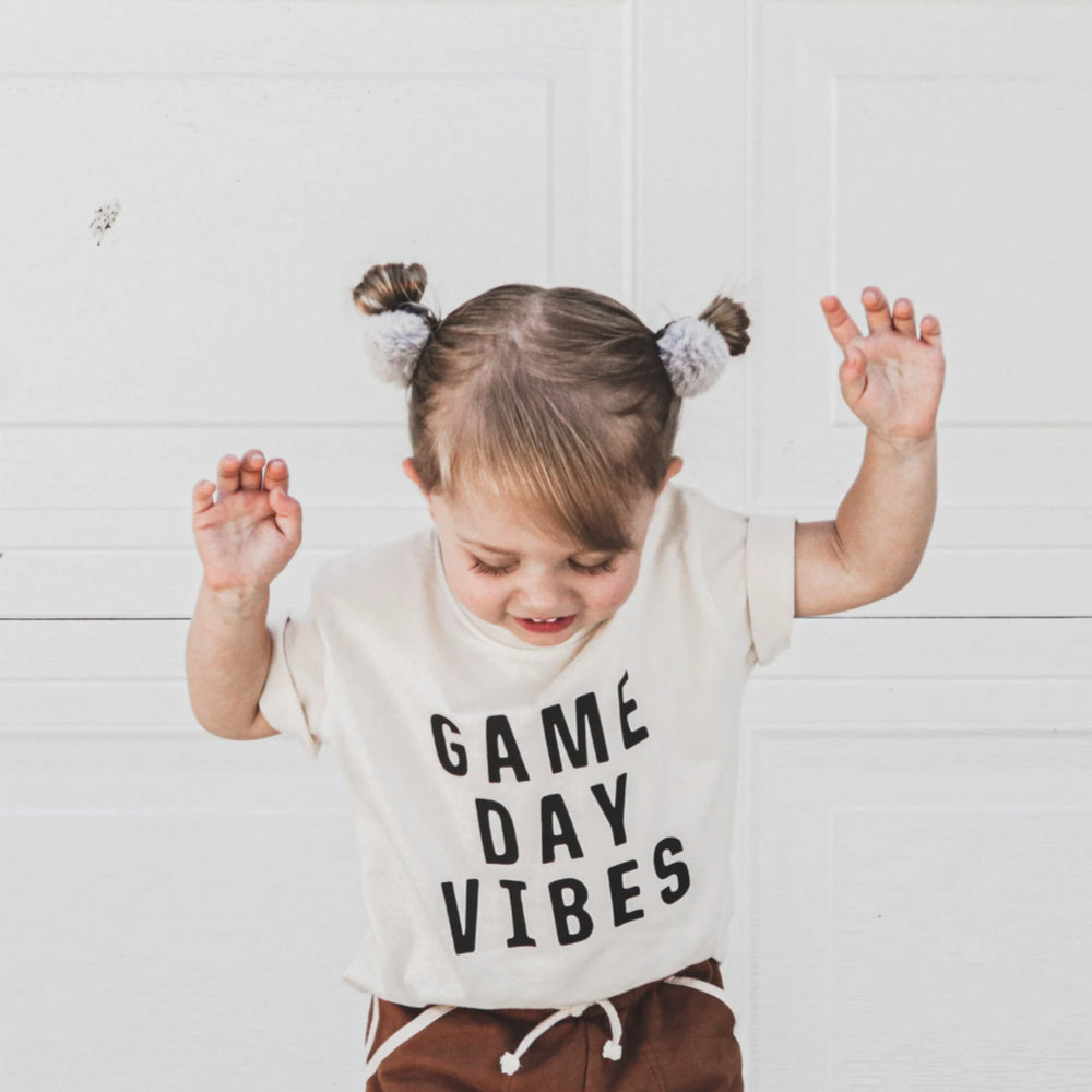 Game day vibes! This super soft, 100% cotton natural colored tee collection is available in sizes for the whole family and perfectly matched in color. All of our apparel is professionally printed in-house in sunny Southern California.