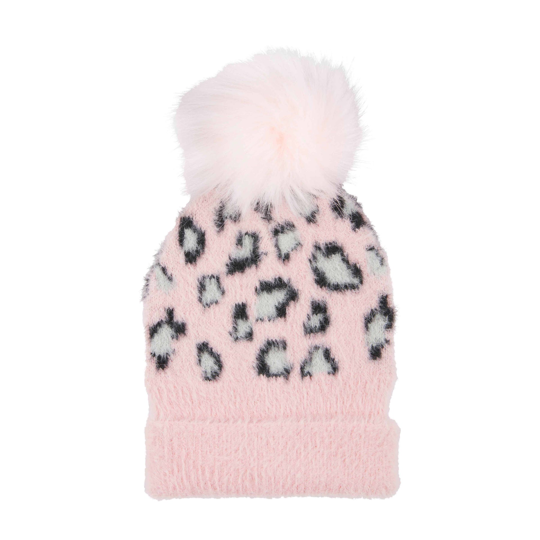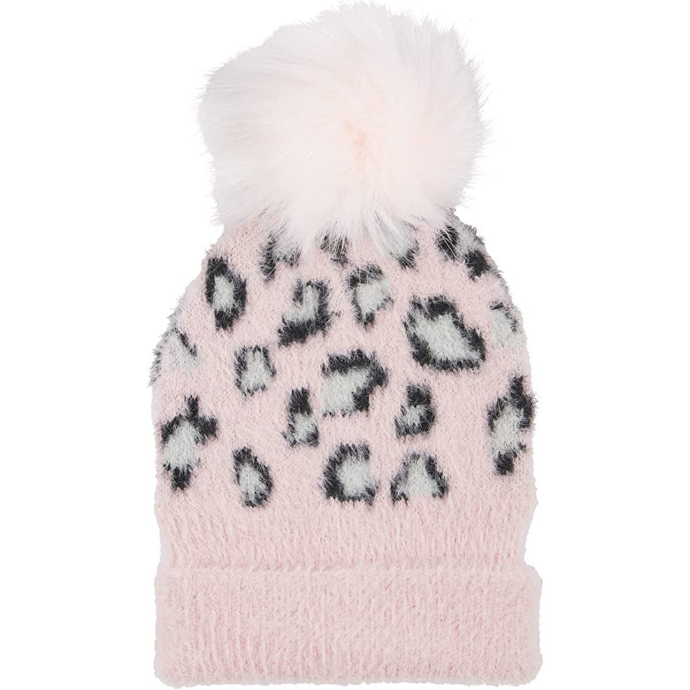 Get ready for snuggle weather with our fuzzy pink leopard pom beanie.